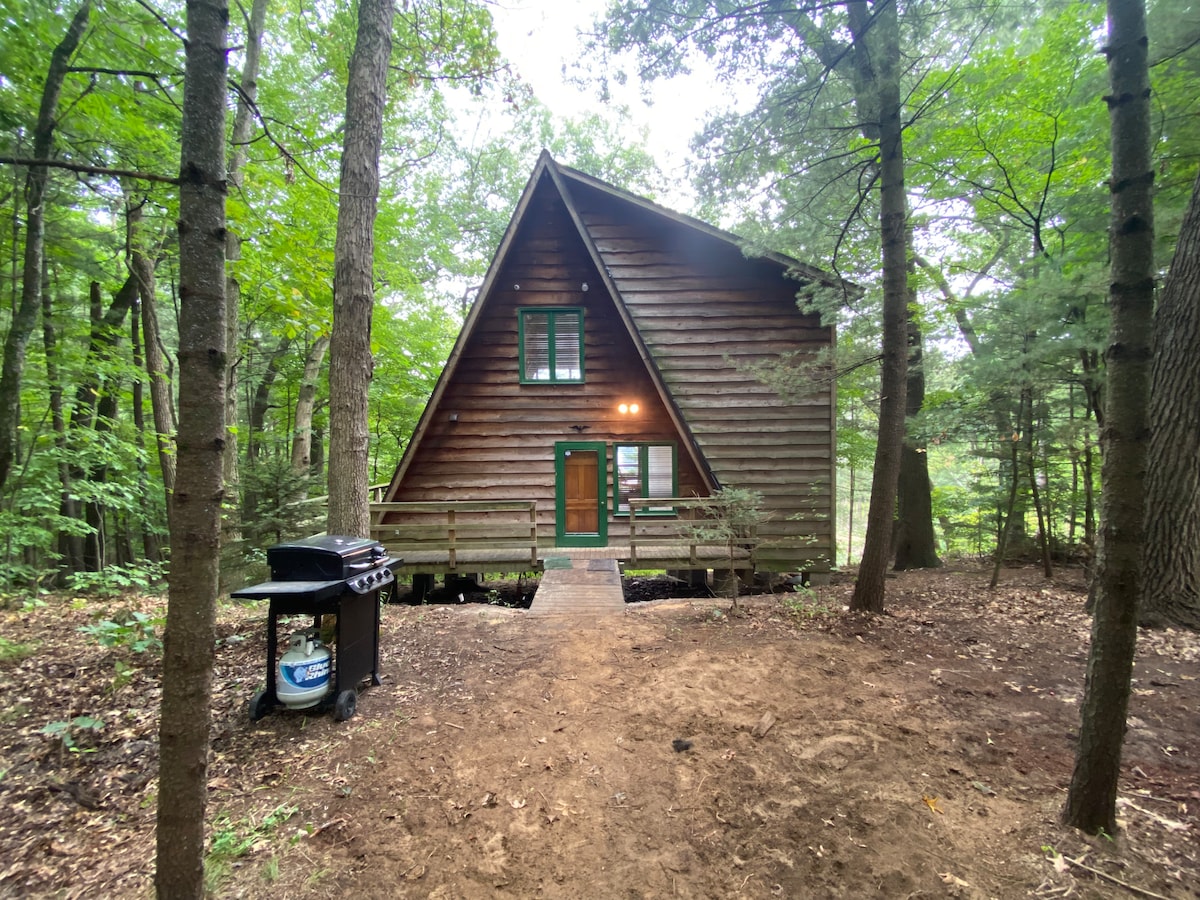 Ubicada en un bosque junto al lago, esta encantadora cabaña en forma de A ofrece vistas serenas a través de grandes ventanas. Las comodidades modernas, que incluyen una cocina gourmet y calefacción y aire acondicionado, te esperan en el interior. Despierta con el canto de los pájaros, disfruta de una amplia cubierta y crea recuerdos inolvidables en la naturaleza. ¡Tu escapada perfecta te espera!
