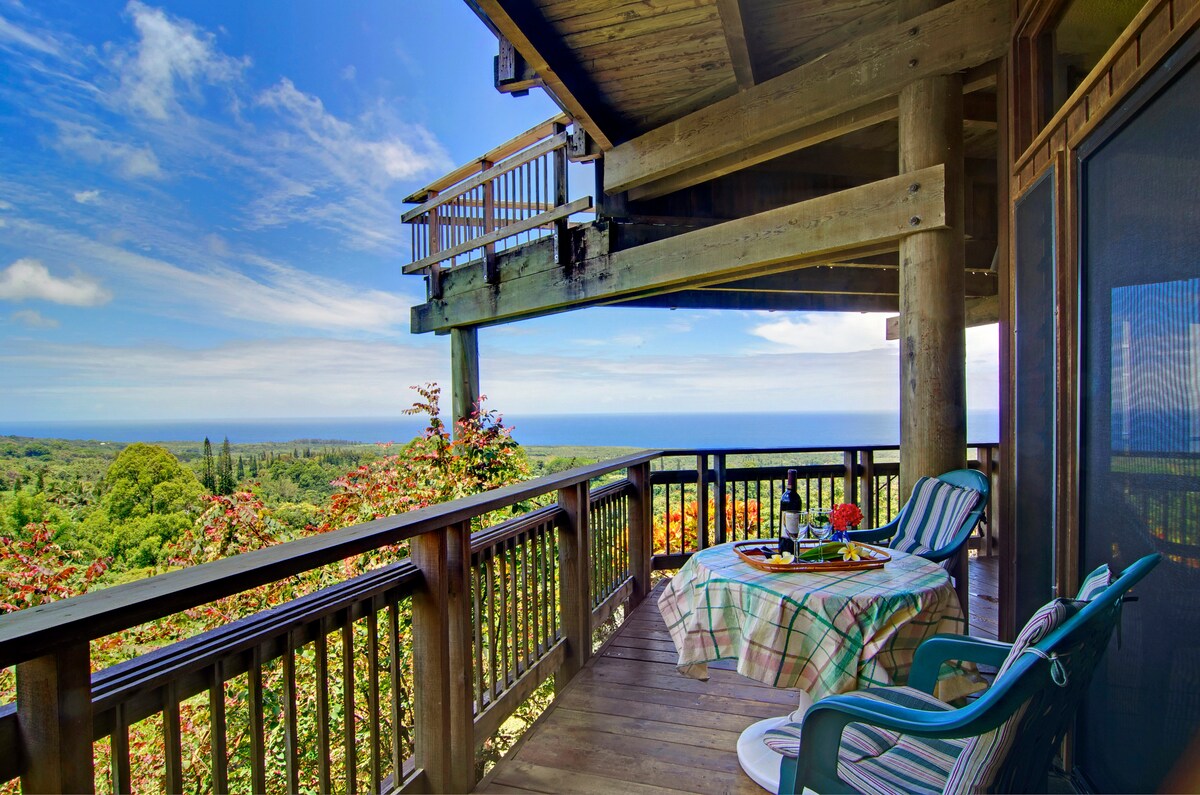 La casa de campo se encuentra en la parte superior de nuestra exótica granja de frutas de 5 acres. Disfruta de tu estancia recorriendo la propiedad y relajándote en nuestro acogedor hogar lejos de casa. La casa está equipada con todo lo necesario sin el desorden. Desde la sala de estar, disfruta de vistas al mar, árboles frutales y flores tropicales. Escucha el canto de los pájaros por la mañana y observa cómo el cielo cambia de color al atardecer. Nuestros alojamientos tienen licencia del estado de Hawái. Nuestro número de licencia es BBHA 2020/000.