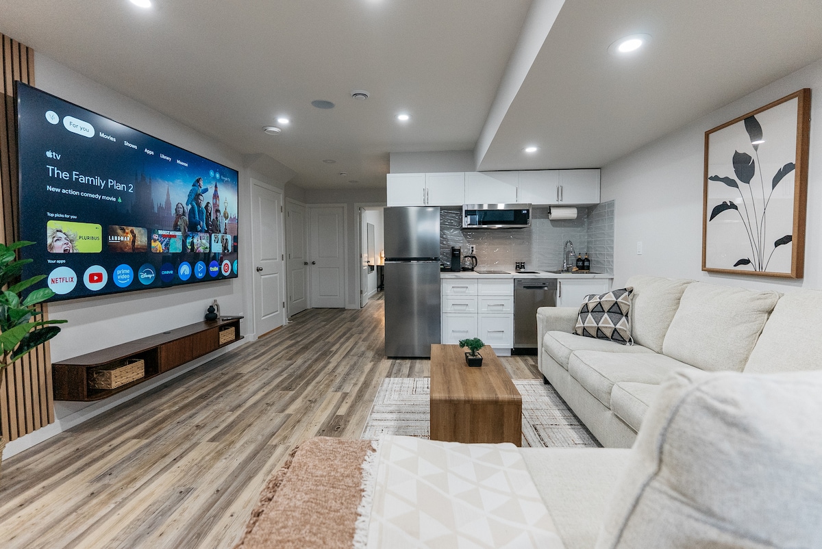 Brand new feel! Quartz kitchen, fully stocked, island, laundry. Spacious master w/walk-in. Smart TVs in all rooms. Tiled shower. Double off-street parking. Blocks from main avenue. Open concept living/dining. Perfect for families/groups. Enjoy a bright, airy space. Cook, relax, socialize. Convenient location. Modern comfort, easy access. Ideal for short/long stays. Home away from home! For longer stays of 2 weeks or more, we provide "maintenance" cleaning once a week on us!