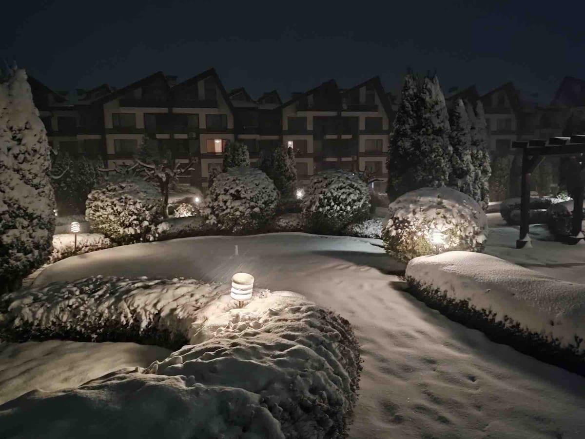 A 300 metros de las pistas (justo al otro lado de la carretera) en nuestro tranquilo y hermoso apartamento de dos dormitorios y dos baños con balcón y vistas a la montaña. Con cocina nueva totalmente equipada (con lavavajillas), TV inteligente de 55pulgadas, excelentes camas nuevas y WIFI de alta velocidad, para transmitir Netflix o trabajar a distancia. ¡Incluye piscina durante todo el año, SPA, sauna, restaurante, bar, masaje, jardín al aire libre, recepción, alquiler/vestuario de esquí y BUEN personal! Te damos la bienvenida a nuestro lugar favorito en Bansko. Nos encanta este lugar y te prometemos que tú también lo harás.