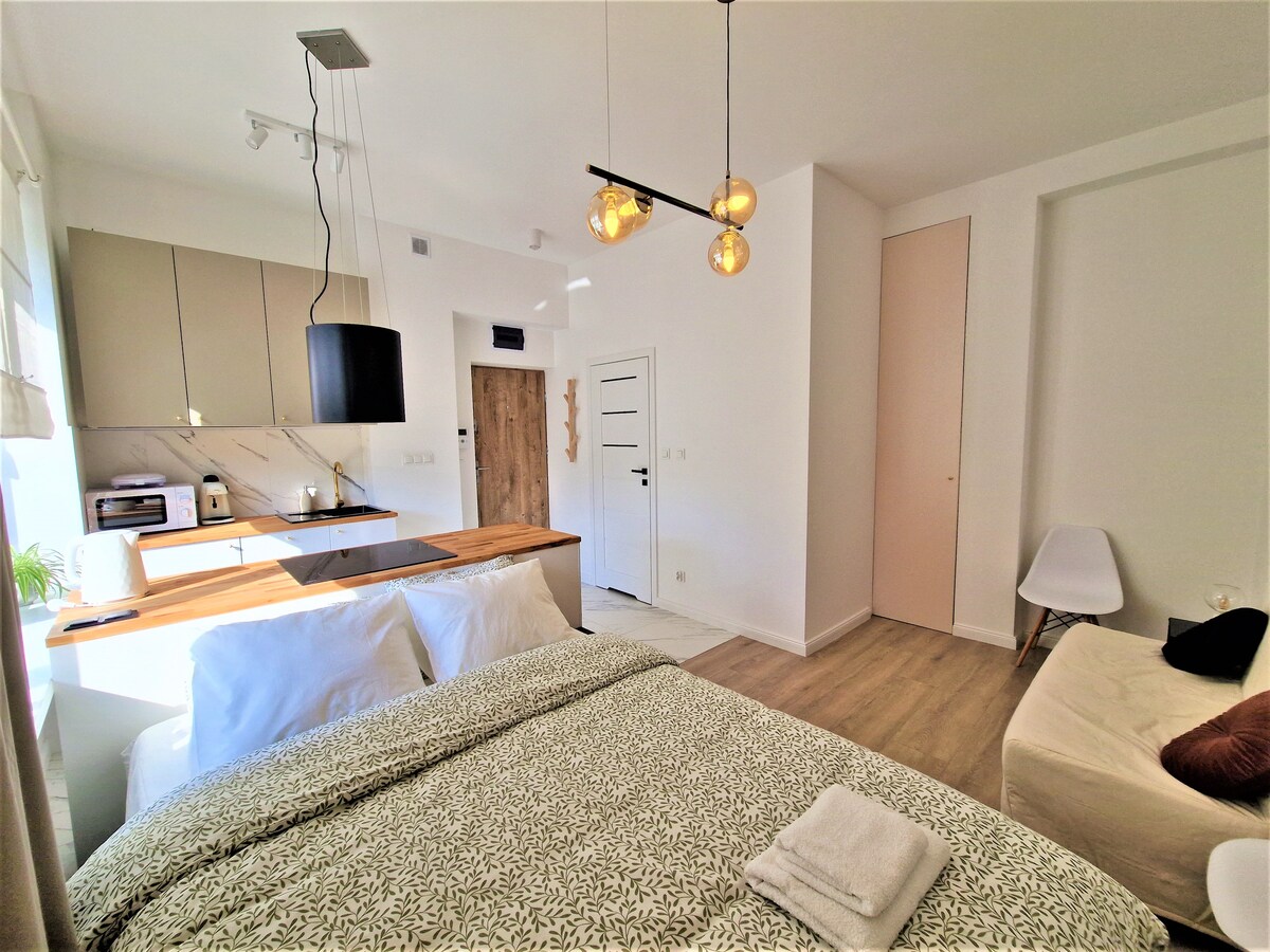 Apartamento cómodo y totalmente equipado en un edificio nuevo. Sala de estar con cocina abierta dividida en comedor y sala de estar. El dormitorio tiene una cama grande y un armario espacioso. También hay un armario como espacio de almacenamiento adicional. En la zona hay tiendas, restaurantes y cafeterías. Equipamiento: aire acondicionado, cafetera, hervidor de agua, plancha, tabla de planchar, lavadora Cómo llegar desde el aeropuerto de Chopin 20 minutos en taxi 50 minutos en transporte público desde el aeropuerto de Modlin 50 minutos en taxi 120 minutos en transporte público