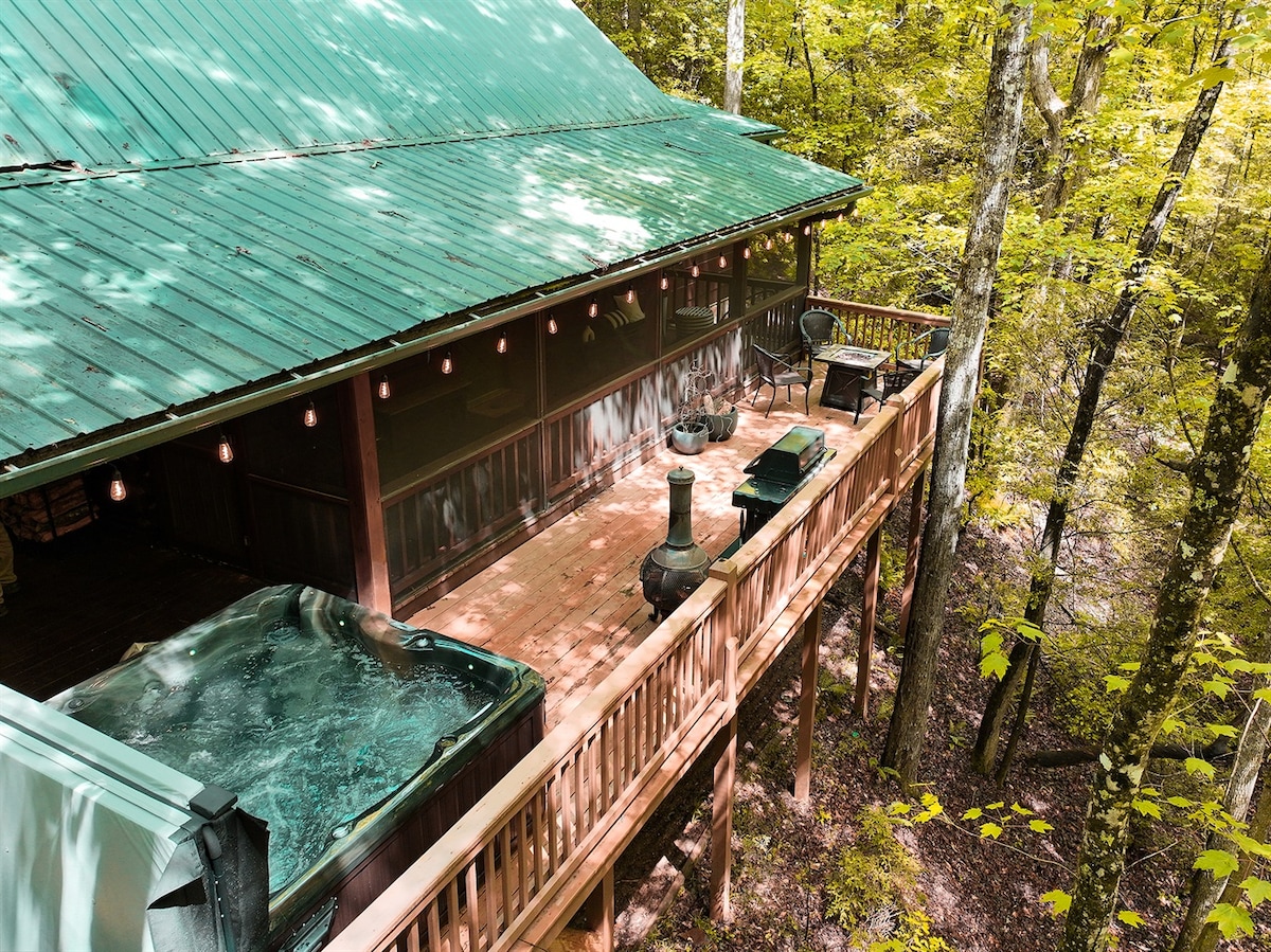 ¡Tu escapada a Blue Ridge Mountain View te espera! Disfruta de impresionantes vistas a la montaña de 50 millas desde esta inmaculada cabaña de madera. Diseñado para la relajación y el romance, con múltiples cubiertas al aire libre, jacuzzi privado, acogedoras chimeneas interiores y exteriores, fogata y mesa de billar. Perfecto para ocasiones especiales o parejas, con dos suites King separadas para mayor privacidad. Actualizado y abastecido con elementos esenciales, combina el encanto rústico con la comodidad moderna; situado exactamente entre Blue Ridge y Ellijay.