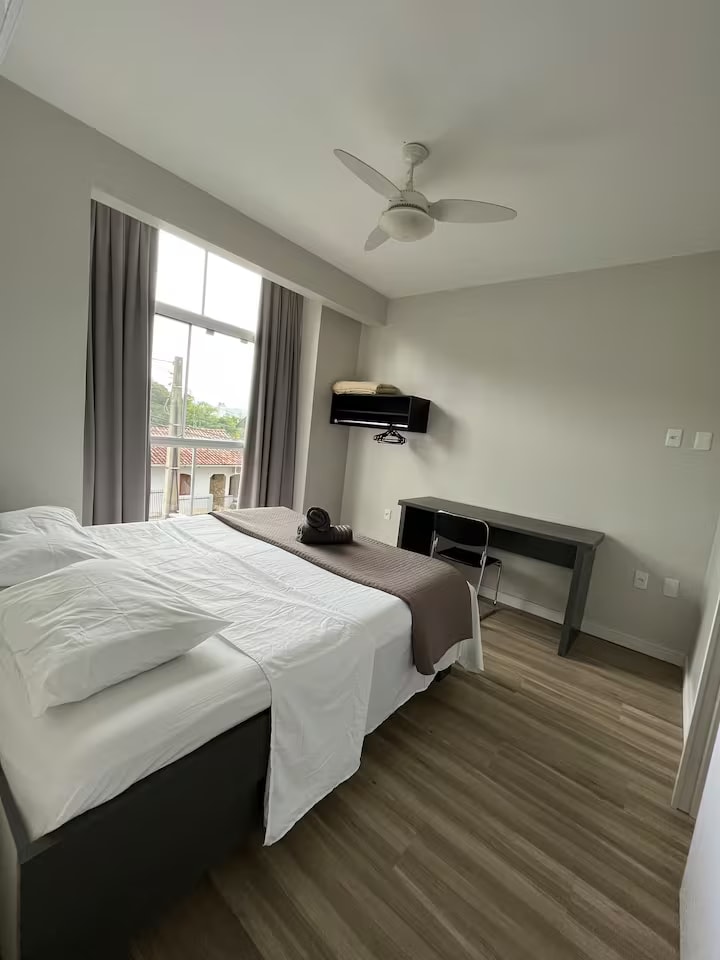 Sofisticado apartamento tipo estudio ubicado a 800 metros del parque Vila Germânica, lugar de eventos como el Oktoberfest. Rodeado de restaurantes, bares y supermercados. Todo para su comodidad: Smart TV 50" Samsung, aire acondicionado split, ducha de gas, wifi fibra 240mb, cocina completa con heladera Brastemp, microondas, horno, estufa, campana extractora, cafetera, purificador de agua, lava y seca, armarios, y por supuesto ¡una cama queen con el mejor colchón!