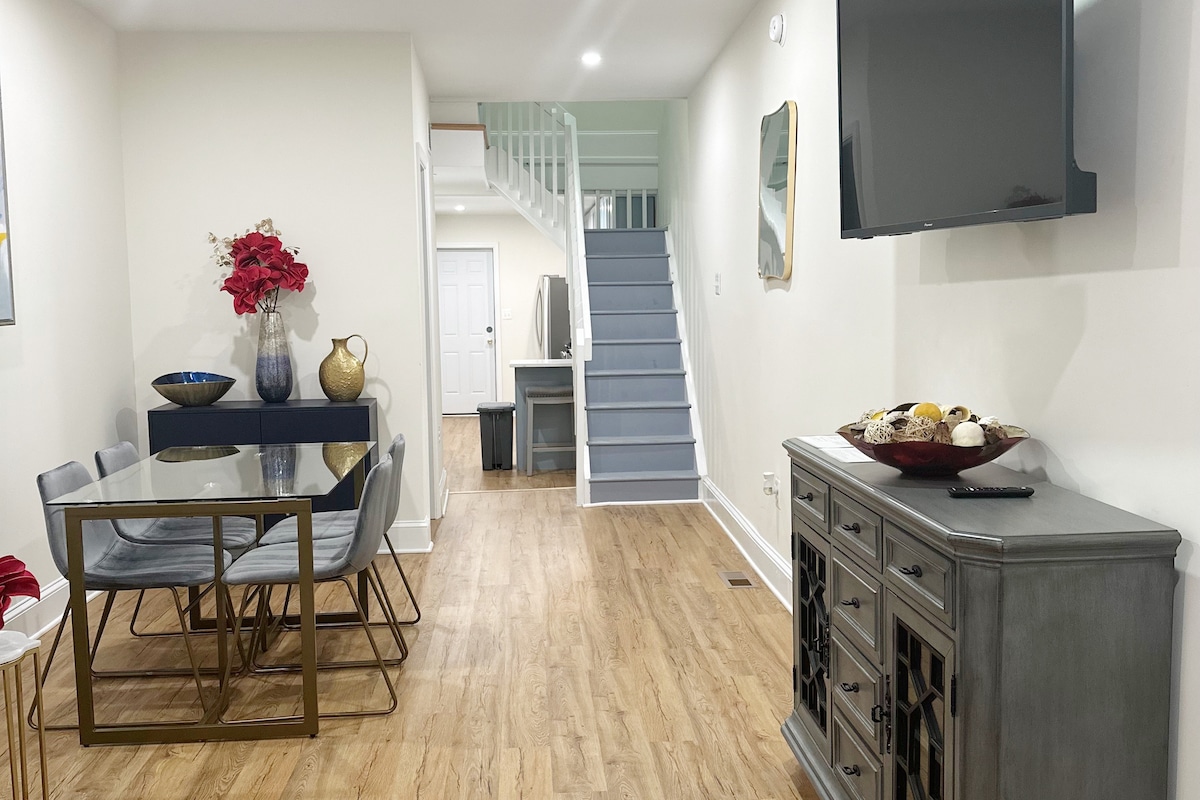 ¡Visita el corazón de Baltimore en esta casa de 3 dormitorios y 2,5 baños bellamente renovada para un máximo de 6 huéspedes! Cada dormitorio y sala de estar incluye una Smart TV con internet de alta velocidad. También se proporcionan elementos básicos de cocina y artículos de baño, que incluyen: café de cortesía Keurig Starbucks, todas las sábanas y una plancha. Este espacio es ideal para trabajadores remotos, profesionales médicos y aficionados al deporte a solo 3-5 minutos a pie del Hospital de la Universidad de Maryland y cerca de estadios deportivos populares.