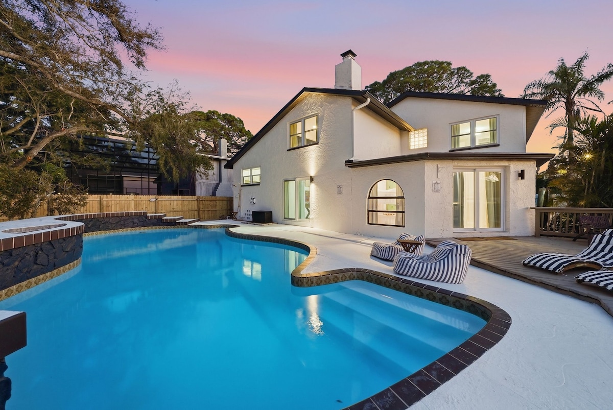 ¡Bienvenido a Seminole Shores Villa, tu oasis de spa tropical de 223 m²! Esta propiedad es un alojamiento de 4 dormitorios con un montón de servicios para que disfrutes de una estadía inolvidable. Aunque las playas están cerca (<5 min), es posible que nunca quieras salir de la piscina climatizada de agua salada ubicada en un enorme patio trasero tipo spa, que ofrece mucha privacidad y actividades. Esta casa fue completamente renovada en 2023 para incorporar un diseño tropical. Priorizamos un entorno limpio y seguro como parte de tu experiencia.
