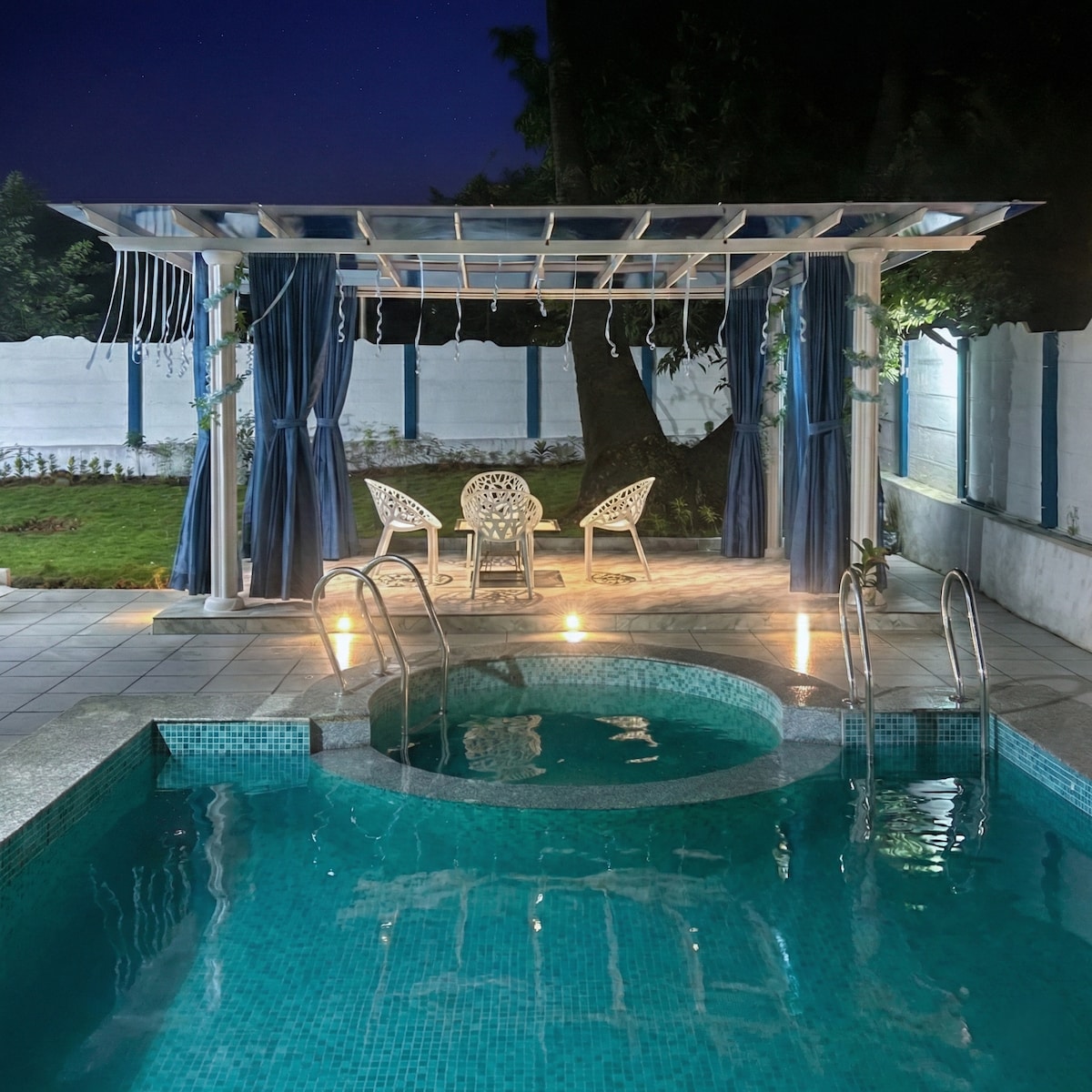 Bienvenido a nuestra impresionante villa 2BHK, un refugio perfecto para familias,parejas o grupos que buscan lujo y comodidad. Ubicada en Nirvana Wollywood,esta villa cuenta con amplios dormitorios elegantes con baños modernos y una cocina totalmente equipada. Disfruta,relájate junto a la piscina privada,salón en el patio,cena al aire libre en medio de una exuberante vegetación, wifi de alta velocidad, aire acondicionado, TV inteligente, decoración elegante, estacionamiento privado. Esta villa ofrece una mezcla perfecta de relajación y comodidad. Reserva una villa ahora para una experiencia inolvidable.