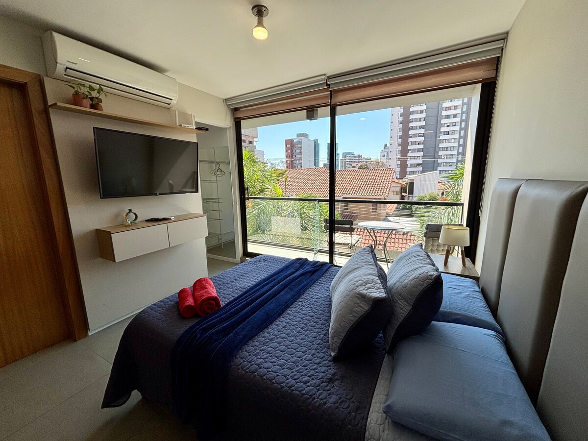 Te ofrecemos una estadía cómoda, en un espacio moderno con estilo minimalista y un servicio de primera calidad. Departamento nuevo, totalmente amoblado y con un balcón que te permite una amplia vista a la ciudad. Está ubicado en la mejor zona de Santa Cruz cerca de muchos restaurantes, malls y centro empresarial. Ideal para ejecutivos o parejas. Tienes acceso a las áreas sociales del edificio: zona co-work, piscina, churrasquera, lavanderia. (fotos) Y en la terraza funciona un resto bar.