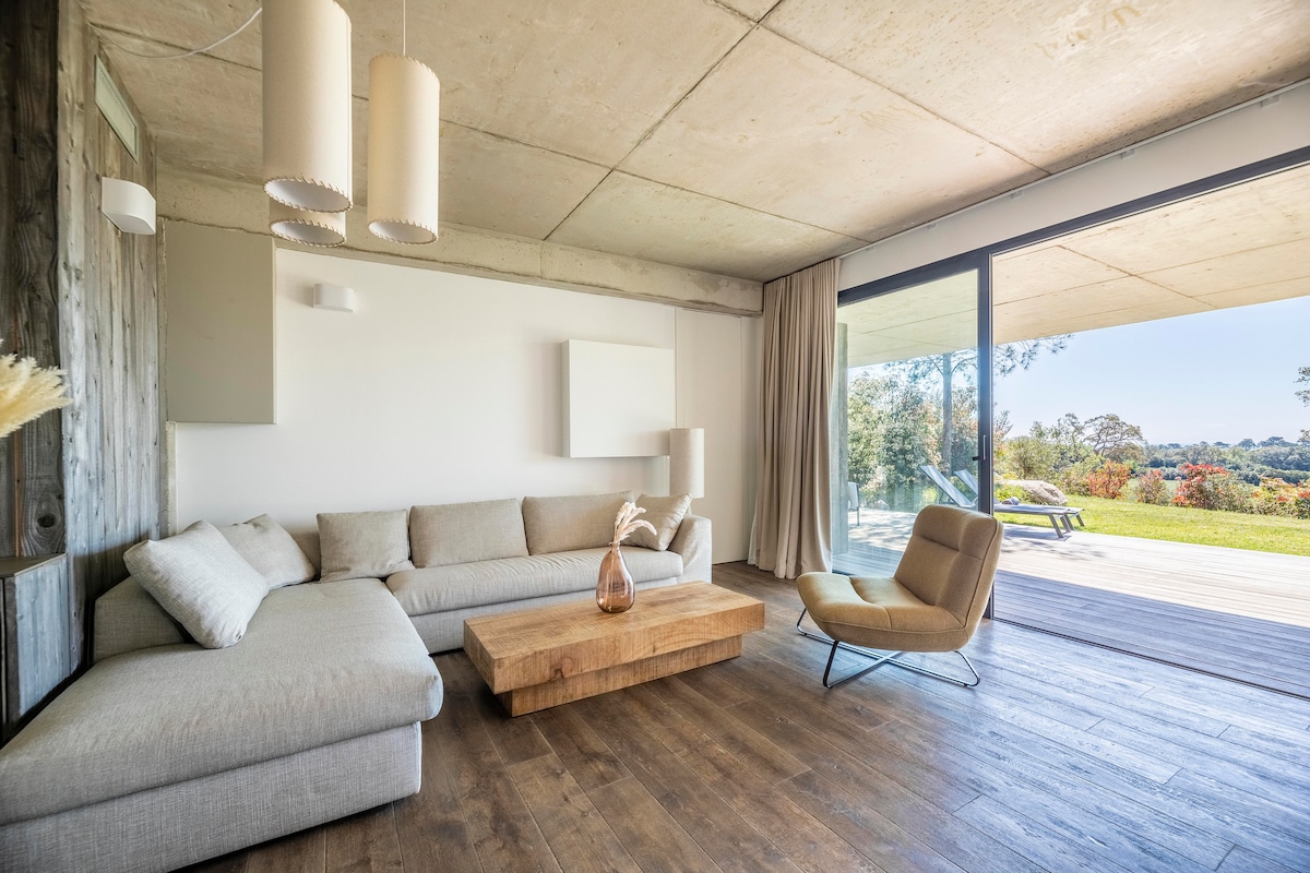 Loft dúplex de lujo, nuevo, situado en una gran casa familiar con carácter, a 10 minutos de la playa de Santa Giulia, a 15 minutos de Porto Vecchio y a 20 minutos de Bonifacio. El espacio principal de 45 m2 es completamente acristalado en sus 2 fachadas. Ofrece una vista de la que no nos cansamos, sobre el maquis, las colinas graníticas y a lo lejos, la magnífica cadena montañosa que se puntea por la cumbre más al sur de Córcega: l 'Omu di Cagna. Un verdadero paraíso para unas vacaciones de ensueño