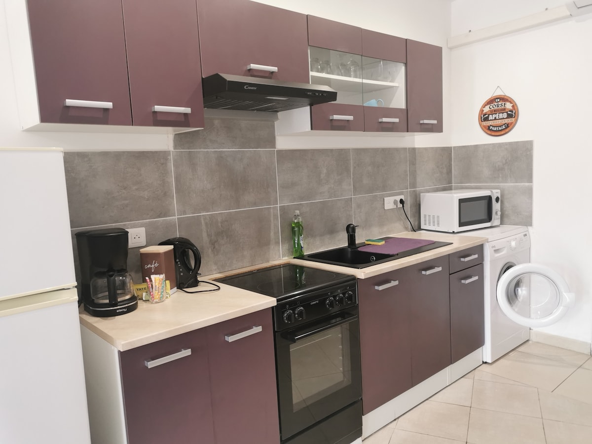 estudio de 30 m² con sofá cama y cocina equipada (nevera congelador, placa de inducción, mini horno, tostadora, hervidor de agua, cafetera). El baño está equipado con lavadora y secador de pelo. Aparcamiento gratis para un coche. el estudio se encuentra a 1,5 km del centro de la ciudad de Porto vecchio, a 7 km de la playa de Santa guilia, a 20 km del ospédale (altitud 1000 m).