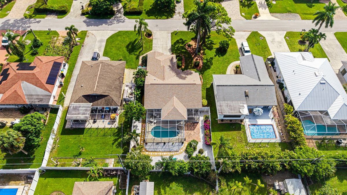 Bienvenido a nuestra casa unifamiliar con piscina recién reformada en el corazón de la histórica Bonita Springs. A menos de 5 millas de las playas. Puedes ir caminando a cafeterías, parques, restaurantes y todo tipo de mercados, etc. La sala de estar se extiende hacia el exterior en el enorme lanai cercado donde tenemos un nuevo sofá modular al aire libre. La piscina es grande y está climatizada. Una cocina muy mejorada con nuevos armarios de cierre suave, encimeras de cuarcita y electrodomésticos nuevos. Es un diseño cómodo de concepto abierto.