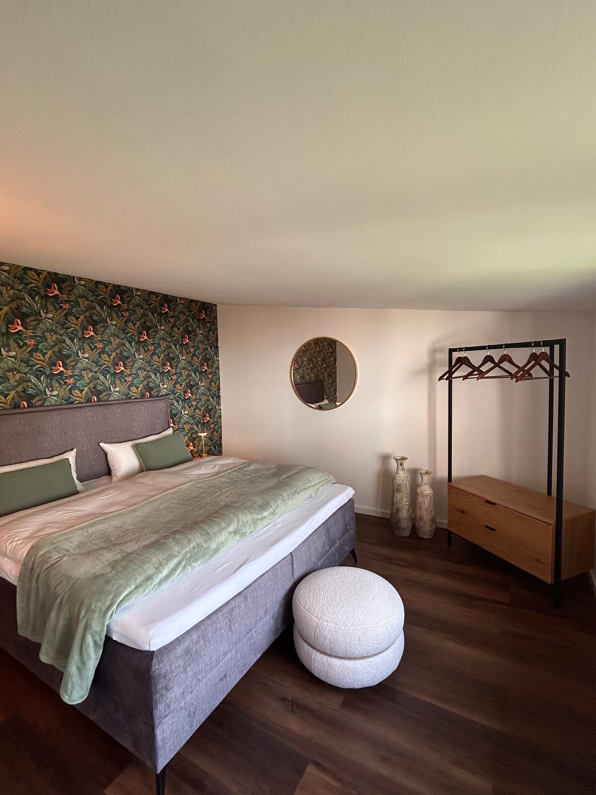 Das Zimmer befindet sich auf der Hofseite unseres renovierten in den 50er Jahren gebauten Bauernhauses, direkt neben unserem Pferdestall. Es ist im vintage Stil mit alten Möbelstücken, die liebevoll aufgearbeitet wurden, ausgestattet und strahlt viel Gemütlichkeit aus, die zu der ländlichen Gegend passen. In unmittelbarer Nähe befinden sich mehrere Seen, die zum spazieren gehen einladen. Auch für Radtouren entlang der Lippe ist der Ort ein idealer Ausgangspunkt.