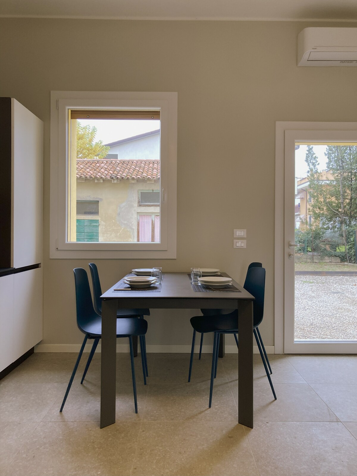 La casa, situada en el centro de Borghetto, una aldea del municipio de Valeggio sul Mincio, está rodeada de vegetación, a la sombra del puente Visconteo. El alojamiento forma parte de un complejo de tres unidades independientes, dentro de un gran jardín compartido, que en conjunto forman la residencia «Cortile alle Mura». Fácil acceso y con posibilidad de aparcamiento dentro de la propiedad.