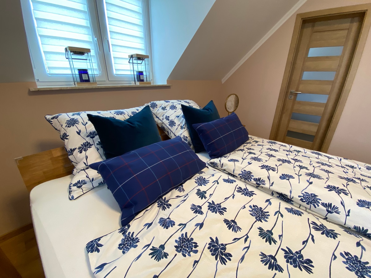 Apartamento de 2 habitaciones hermoso y amueblado de forma moderna/apartamento de vacaciones para uso exclusivo de los huéspedes. El precio incluye servicios públicos, ropa de cama, toallas y limpieza final. Apartamento para no fumadores. Cocina con cocina y refrigeración, cafetera, tostadora, hervidor de agua, microondas/horno pequeño, TV. Baño moderno con ducha grande. Dormitorio con armario empotrado. Sala de estar con TV (y posibilidad de dormir condicional para niños pequeños en el sofá). El propietario vive encima de este apartamento en la misma casa.