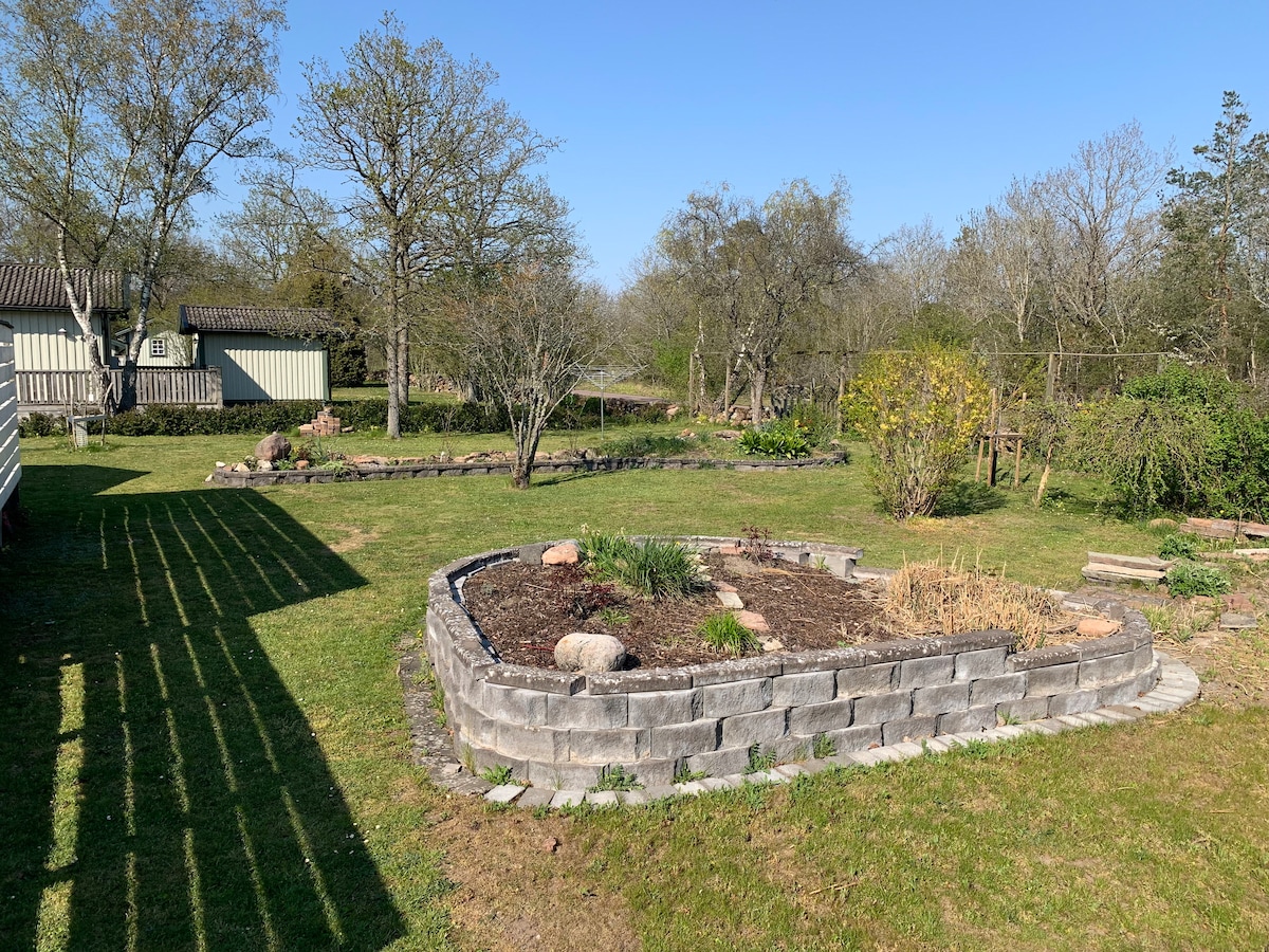 Lugnt o skönt område på östra sidan av Öland nära djur o natur.Nära till badplats ca 4-5 min med bil,cykel o promenadvägar.Närhet till Ölands Alvar med unik flora,ca fem mil till Ottenby fågelstation.Cyklar o grill finns att låna!Här är även fyrbenta familjemedlemmar välkomna om de är kopplade. Lakan,handdukar o morgonrockar ingår.Även ett spabad finns att njuta i! Städning utföres av värdarna mot en avgift numera pga vi vill ha en viss standard! Katter finns hos värdarna. Ac finns i sovrummet.