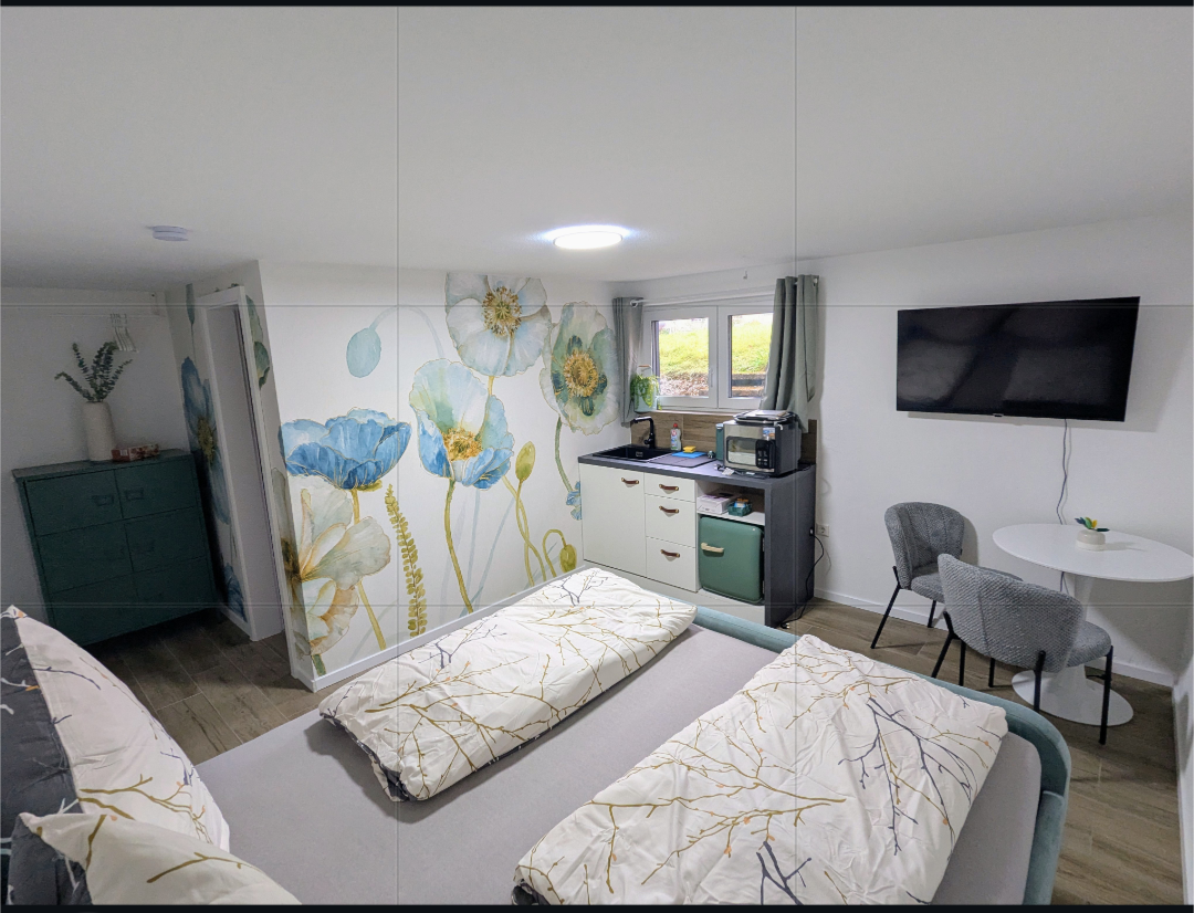 Modernes 20 m² Studio sehr Grenznah mit eigenem Bad mit Tageslicht, Regendusche und Mini-Küche. 180×200 Bett, Smart-TV (Netflix/Google TV), Kühlschrank, Spüle, Mikrowelle, Nespresso Kaffeemaschine, Wasserkocher, Geschirr. Viel Tageslicht, self-check-in, nagelneu renoviert. Ideal für Alleinreisende oder Paare, die Komfort und Unabhängigkeit auf kleinem Raum schätzen – Egal ob entspannen, Arbeiten, Reisen, streamen & genießen!