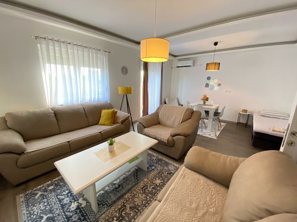 Rent a car 10m from apartment! Airport shuttle! Completely new and equipped apartment of 110m², with a beautiful yard in an ideal location. 2 km from the airport, 6 km from Podgorica. A perfect place for a vacation with the family in a wonderful domestic atmosphere and a yard that relaxes all the senses...