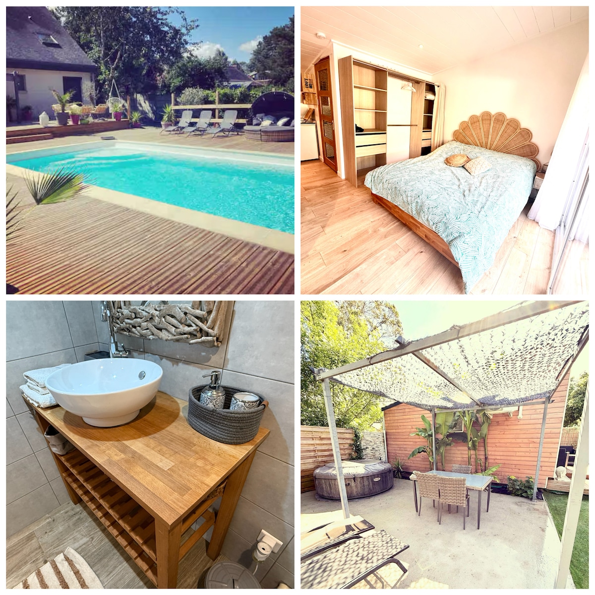Ô'date, casa rural romántica clasificada **** con su tranquilo SPA privado al aire libre para un fin de semana o un viaje de negocios. Cerca del Erdre, el centro de exposiciones, el estadio Beaujoire y el tranvía. La casa tiene un dormitorio grande en la planta baja con una cama tamaño king de 180 x 200, una sala de estar y una zona de cocina totalmente equipada. Un baño con una gran ducha a ras de suelo. Arriba hay un altillo con 3 camas individuales que pueden formar una segunda cama tamaño king. Estacionamiento Gratuito FIESTAS PROHIBIDAS
