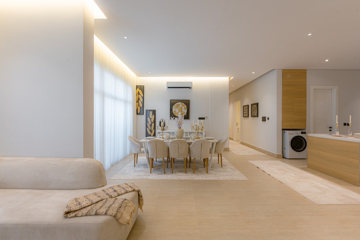 Apartamento lujoso y espacioso con un diseño moderno de lujo, muebles de alta calidad para la comodidad de los huéspedes y total privacidad. El departamento consta de: - - Amplio vestíbulo principal (con aseo) * Sala secundaria * Comedor * Cocina * Dormitorio con una cama tamaño king (principal) * Dormitorio con cama tamaño «king» * Baño * Lavandería + trastero * Sesión al aire libre * Estacionamiento privado * El apartamento tiene una entrada principal al edificio y una segunda entrada trasera privada Entrada autónoma: wifi 5G En el corazón de la temporada de Riad Cerca de Boulevard City, a 2 minutos en coche King Abdullah Financial Center 12 min Todos los servicios y restaurantes están disponibles cerca del apartamento.
