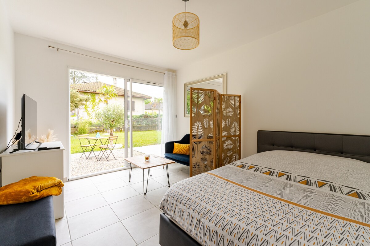 Encantador estudio renovado situado en el corazón de una pequeña comunidad tranquila, con cocina equipada (placa de cocción + microondas multifunción + nevera+cafetera tipo Tassimo), un baño, una sala de estar con sofá cama de 2 plazas y un pequeño jardín privado. Cerca, en coche, del aeropuerto de St Exupéry (10 min), de la central de Bugey (10 min) y del estadio Groupama (15 min). Este estudio se encuentra en el trazado de la ViaRhôna. Alojamiento no comunicado con transporte público.