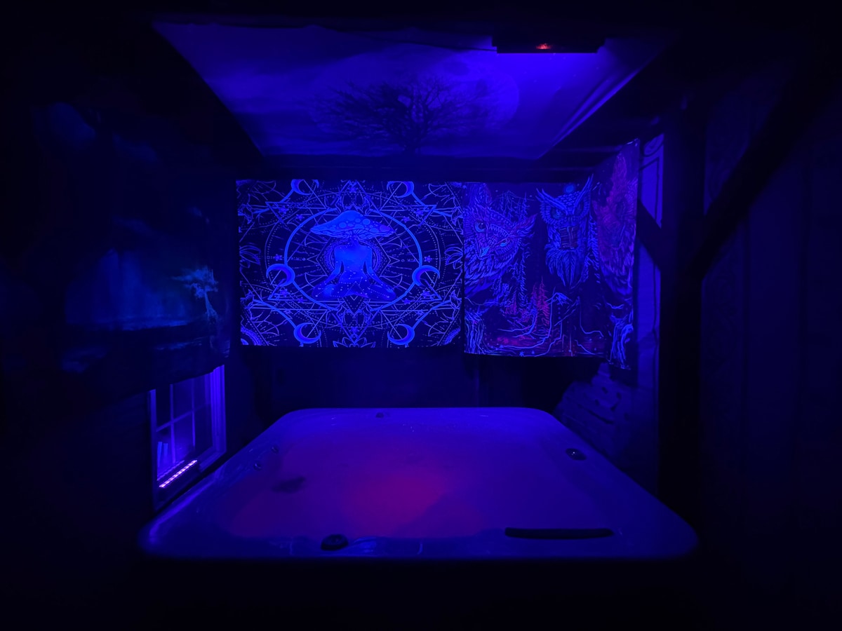 Bienvenido a la cabaña Hideaway, donde podrás relajarte en el abrazo de la naturaleza. Aquí, puedes asar tus platos favoritos en la parrilla, descansar en las sillas Adirondack en el balcón o simplemente relajarte en el interior. Por la noche, reúnete junto al fuego en el porche para ver bailar a las luciérnagas o relájate en el jacuzzi en el porche trasero. Es la mezcla ideal de serenidad natural y comodidad hogareña. En invierno, acércate a la estufa de leña en la sala de estar y ponte al día con tus programas de televisión favoritos.