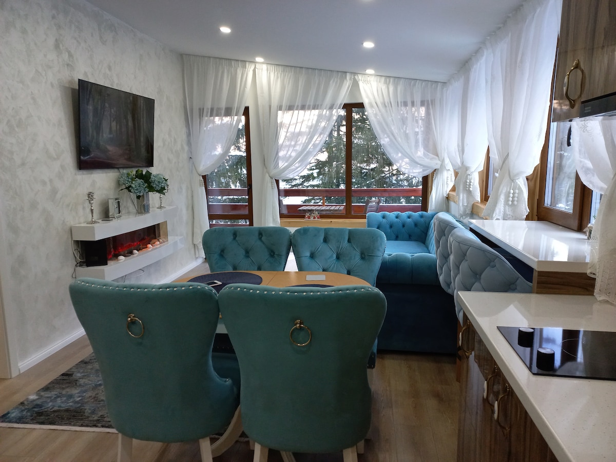 Esperamos que pases una estancia maravillosa en un apartamento nuevo, moderno, lujoso y muy cómodo, ubicado en un complejo residencial completado en otoño de 2021. El complejo está situado en la base de la pista de esquí de Kalinderu, que proporciona acceso inmediato a las instalaciones de la pista de esquí. El apartamento ofrece una vista excepcional a las montañas de Baiului, a la pista de esquí y a la Cruz del Caraimán. Consta de 2 dormitorios, baño con bañera y vistas a la montaña, una amplia sala de estar con cocina integrada.