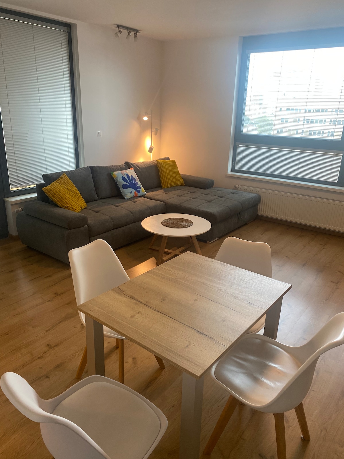 Estudio renovado, elegante y con aire acondicionado con un acogedor espacio en el balcón, cocina totalmente equipada, cómoda cama doble que dará la bienvenida a sus huéspedes. Hay una opción de aparcamiento de pago de 12 €/día alrededor del edificio de apartamentos. Aparcamiento gratuito los sábados. La ventaja de esta ubicación es la distancia a pie a la orilla del Danubio y al centro de la ciudad. Por supuesto, hay conexión a Internet, TV, Netflix, sábanas, toallas, cafetera, secador de pelo y plancha. Posibilidad de usar el minibar.