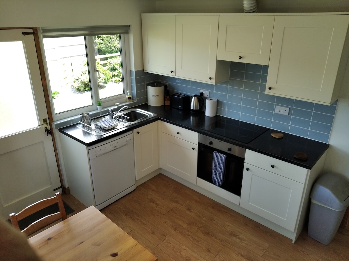 Las vacaciones autónomas engañosamente espaciosas se encuentran en 4,5 acres de terreno en Friars Farm con arroyo adyacente. La propiedad tiene techos abovedados, cama súper tamaño king, con habitación húmeda en suite y otro guardarropa. La gran sala de estar/ comedor también tiene sofá cama para huéspedes adicionales. Calefacción por suelo radiante y quemador de leña, TV con caja de satélite gratuita, cocina bien equipada con muchas instalaciones. Jardín privado bien vallado con jacuzzi y muebles de jardín para tu uso exclusivo.