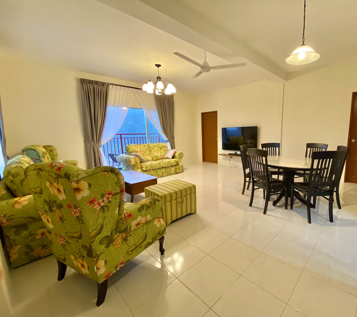 Apartamento completo de 2 dormitorios y 2 baños con salón, comedor y balcón. Para familias de hasta 7 personas (máximo). Buena ubicación, las ciudades de Tanah Rata y Brinchang están a menos de 10 minutos en coche. NO HAY TRANSPORTE PÚBLICO DISPONIBLE y no es adecuado si no se conduce. Pasar Malam, minimarts, tiendas de conveniencia, restaurante abajo. Wifi gratuito de 100 Mbps y Android TV con YouTube. No se permite cocinar (incluido el vapor). Microondas disponible para recalentar alimentos precocinados y cubiertos para cenar en el interior.
