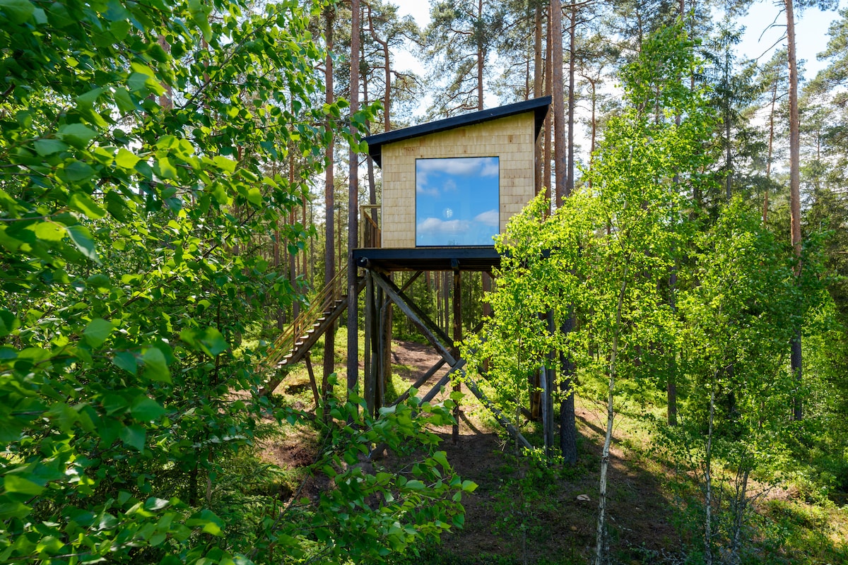 Bienvenido a nuestra cabaña de pino Esta casa del árbol está situada en el hermoso bosque de Småland y ofrece una estancia fuera de lo común. Es íntima, sencilla y tranquila. Aquí, como huésped, dormirás en lo alto de las copas de los árboles y te despertarás con el canto de los pájaros. A través de las grandes ventanas, puedes disfrutar de las vistas del bosque hasta donde alcanza la vista. Aquí tienes la oportunidad de relajarte al máximo, pero para aquellos que quieran más actividad, el alojamiento es un buen punto de partida para excursiones de un día.
