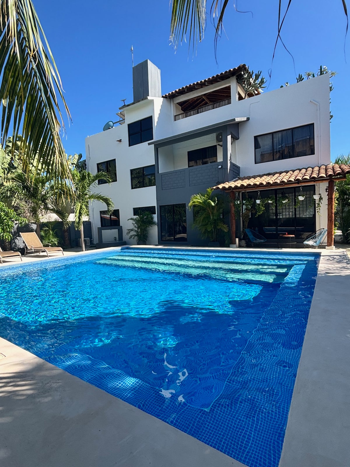 CASA TSUKI, totalmente privada, a 5 minutos de la playa, vista al mar. -WIFI de alta velocidad -4 recamaras con baño completo y aire acondicionado de última generación -5 camas, 2 sofás, la principal con sala grande integrada en el mismo espacio con balcón y gran terraza con otra sala. -Comedor, cocina y gran sala en planta baja -Alberca única en su diseño y tamaño -Palapa en espectacular terraza con sala y cocineta -Garaje para 2 autos -Bodega, sistema de seguridad y Smart TV.