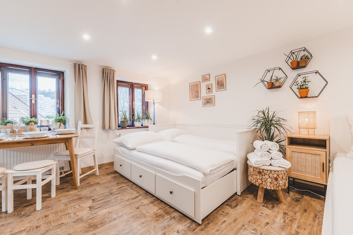 Vítejte v mém krásném apartmánu. Právě jste našli to nejlepší místo pro Váš pobyt v Českých Budějovicích. Můj apartmán má vše, co potřebujete pro Váš pohodlný pobyt, ložnice, koupelna, zařízená kuchyň a super lokalita. Apartmán se nachází v klidné části centra Českých Budějovic , 5 min chůze od náměstí Přemysla Otakara II. Ve vzdálenosti 200m je městský park s lavičkami a fontánou. Apartmán 2+kk je vzdušný, orientovaný na západ. Ubytování je skvělé pro páry, sólové cestovatele a služební cesty.