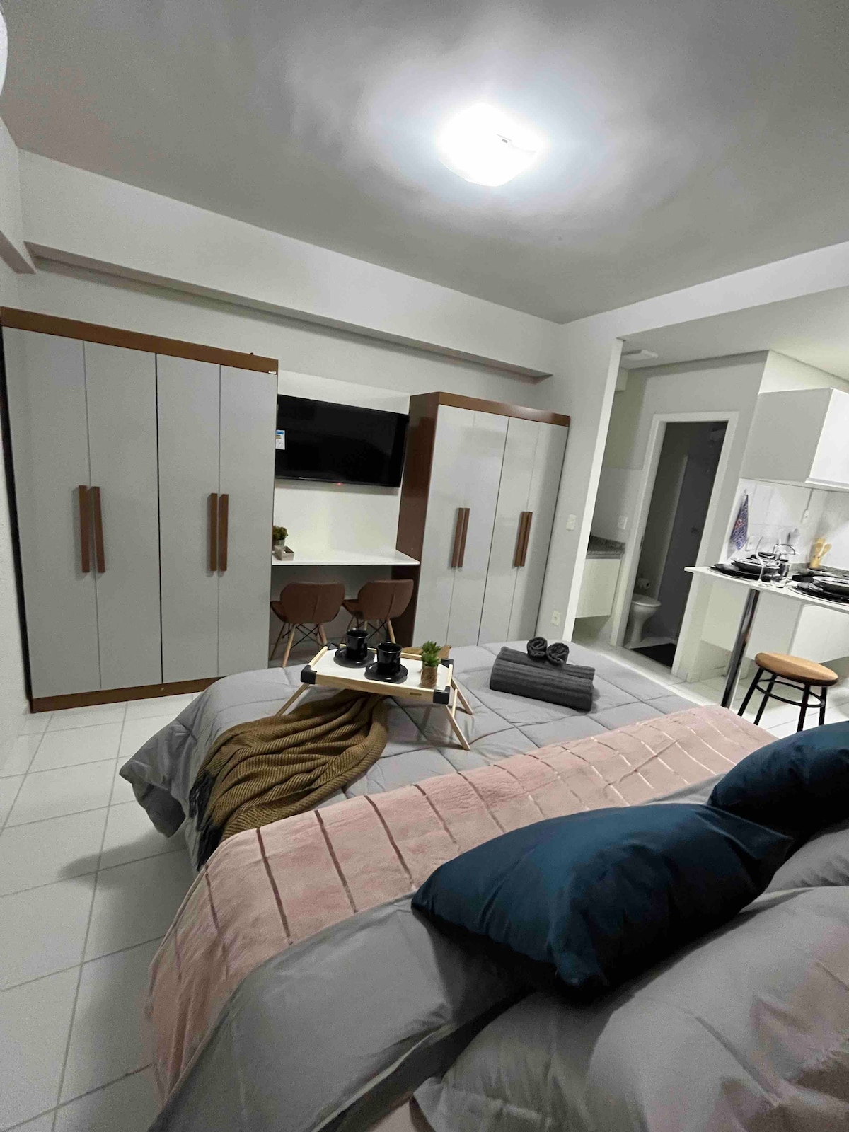 Relájese en este espacio tranquilo y con estilo propio. Estudio completo con Wi-Fi, smart TV, aire acondicionado, utensilios de cocina, filtro de agua y todo lo necesario para su comodidad. Puedes optar por dos camas individuales O 1 cama queen. Disfrute de las áreas comunes como piscina, ascensor, lavandería, estacionamiento, portería 24 horas, sala de estudio o reuniones y espacio gourmet. Excelente ubicación, cerca del hospital São Francisco y de la Facultad Unaerp.