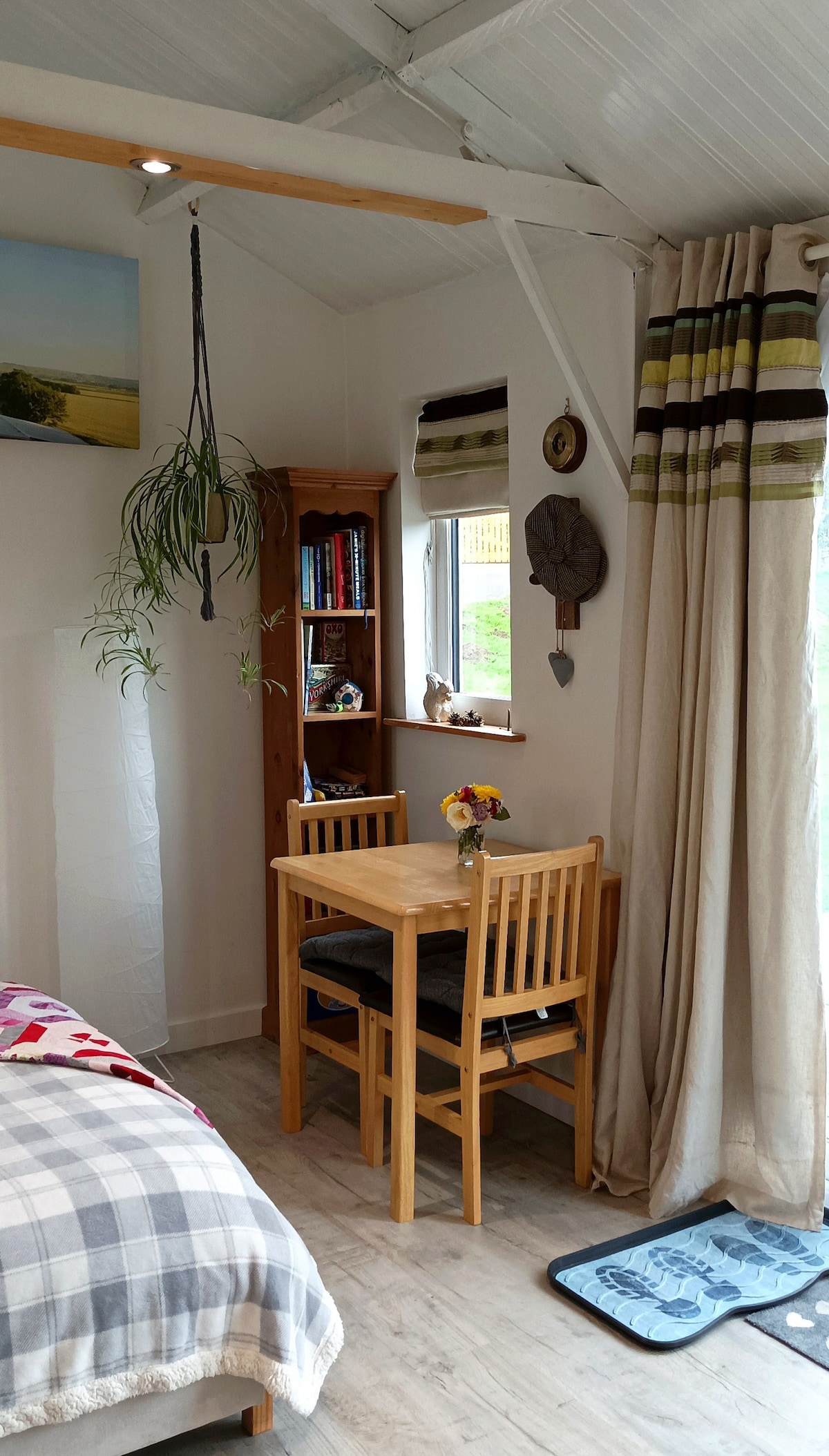 Relájate en esta espaciosa cabaña de un dormitorio con jacuzzi de leña (se aplica una tarifa adicional)en un espacio privado vallado justo al lado de la cabaña. Anfitrión de mensajes por el precio de la bañera. Dentro de la cabaña hay TV lounge, wifi y cocina americana con sofá cama doble para huéspedes adicionales. Hay 1 dormitorio separado con cama doble (ropa de cama y toallas suministradas a costo adicional), colchón,sábana y 2 enchufes. La cocina pequeña tiene microondas, nevera con congelador, hervidor de agua, tazas, copas de vino, platos, tazones, cocina y pequeña barra de desayuno con 2 taburetes de bomba.