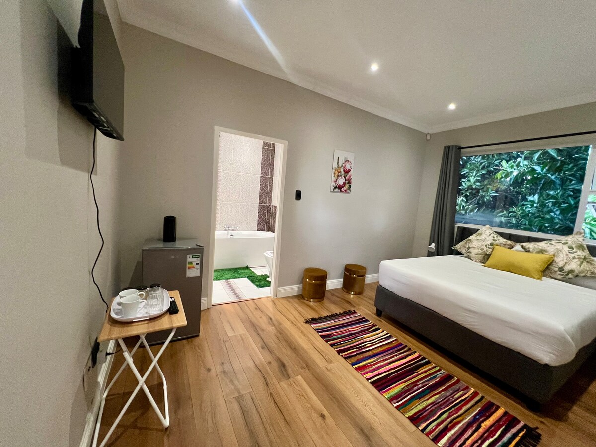 Ven a disfrutar de tu hermoso jardín personal con instalaciones para barbacoa (braai) y siéntate en una mesa a tomar el sol. A solo dos pasos se encuentra tu habitación con aire acondicionado bien equipada, donde podrás relajarte en tu cómoda cama y ver Netflix. Dejamos algo de bebida fría en tu nevera y café y té en tu cocina americana. Después de un largo día de trabajo o una aventura aquí en Gauteng, puedes darte una ducha relajante en el baño de tu suite. Cerca del estadio. ¡Vamos, date un capricho, te lo mereces!