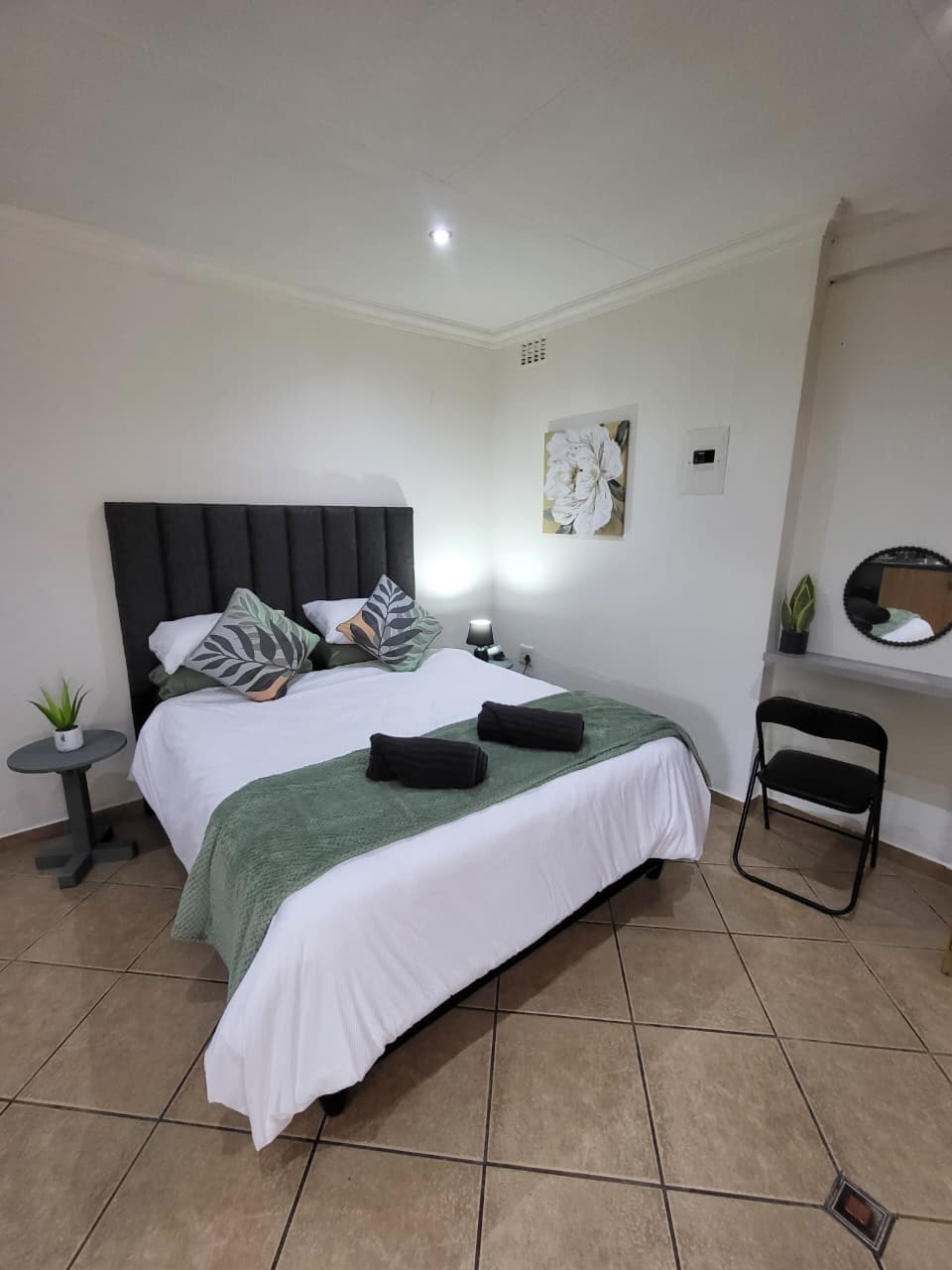 El apartamento de planta abierta está amueblado con una cama tamaño queen, tiene una ducha en suite y una cocina totalmente equipada con estufa y horno, microondas y un televisor inteligente de 43pulgadas con Netflix, y hay wifi gratuito disponible. Tu propio DSTV se puede conectar para transmitir. Patio privado y zona de barbacoa justo al lado de la piscina