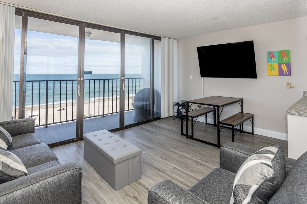Oceanfront two bedroom condo located on the tenth floor, and has an ocean view. The pictures will show the owner's personal touches in making a comfortable and relaxing beach get away. There is a full kitchen and all necessary cookware and dishes. The condo can sleep six people. There is a king size bed in the bedroom number one and a TV. The master bedroom has a king size bed and a TV. There is a queen sleeper size sofa in the living area and TV. Two full bathrooms with shower/bath combo.