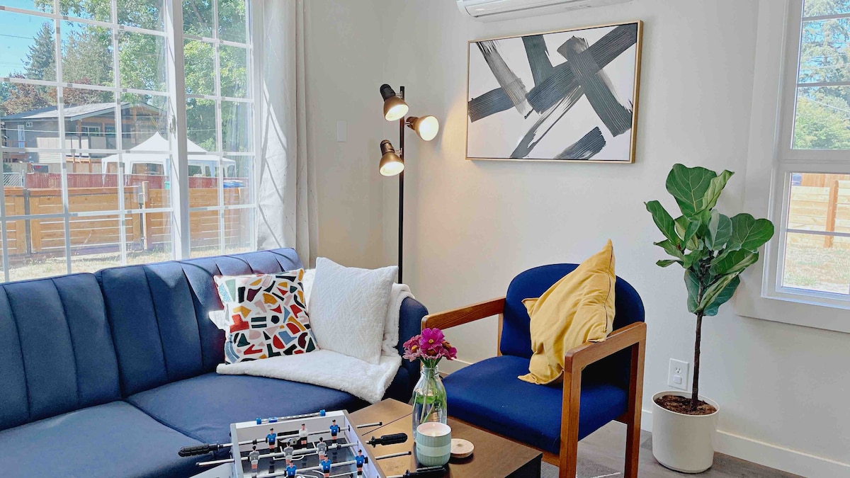 Escapa de la ciudad y recarga energías en nuestro espacioso y recién renovado refugio para huéspedes. Disfruta de una taza de café/té/vino en el patio sombreado mientras contemplas las relajantes vistas del lago Washington y las montañas Cascade. Ponte cómodo en el sofá con una manta y un libro de nuestra estantería seleccionada. O disfruta de tus programas favoritos en el televisor inteligente de 65 pulgadas. Si te inspira preparar una comida, la cocina equipada ofrece una selección de libros de cocina y elementos esenciales de cocina, que incluyen: un horno de gas, ollas y sartenes, utensilios para hornear, aceite y especias.