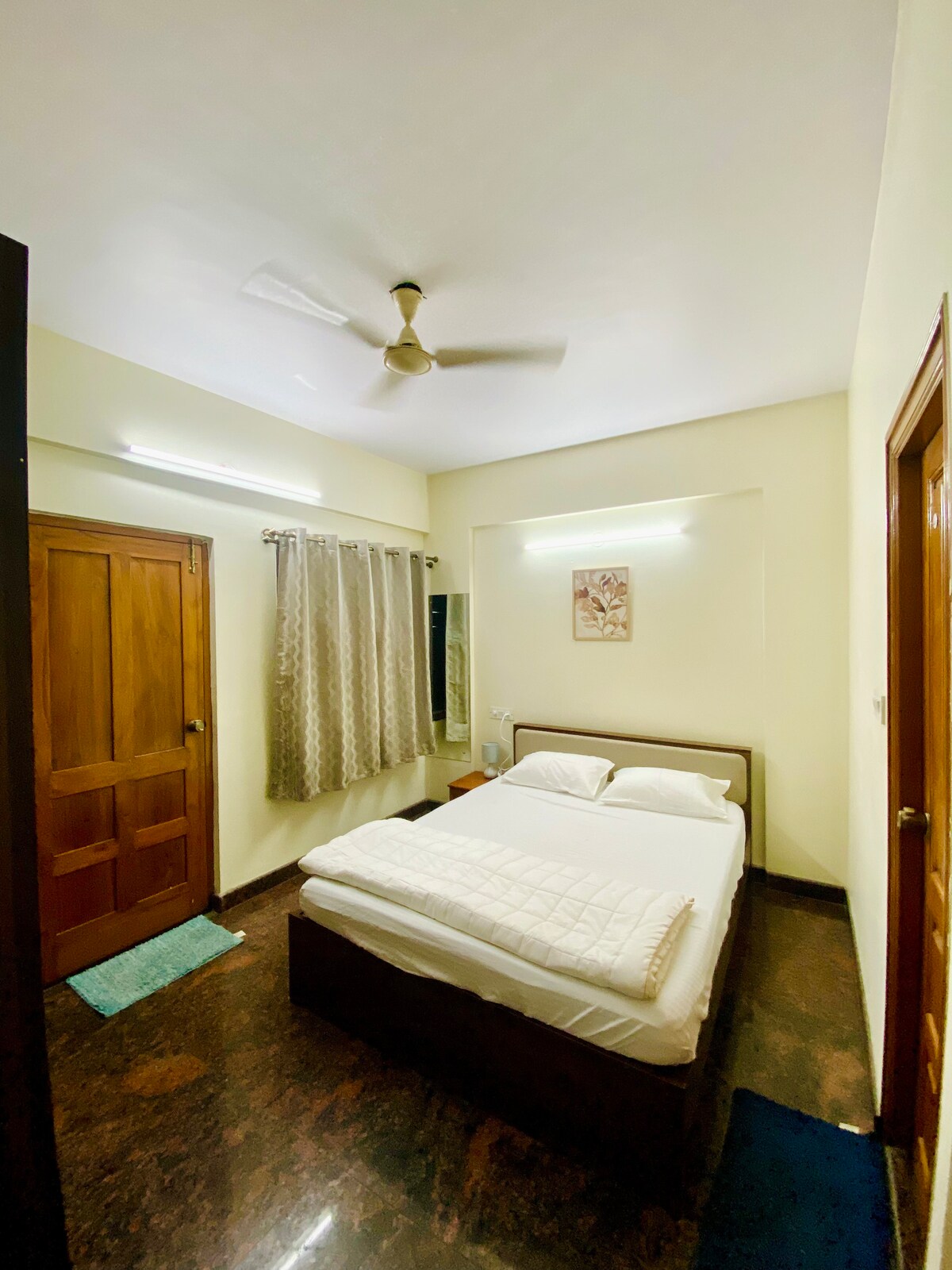 Spacious 900 sq. ft fully furnished stay in BTM, located in a quiet green area with trees around. The property is close to BTM Layout, Silk Board and nearby Metro, making travel easy. The apartment has well-ventilated rooms with basic comfortable furnishings. Guests can cook in the fully equipped kitchen with gas stove and utensils. Amenities include WiFi, Android TV, lift, power backup, housekeeping and laundry facility. Shops and malls are also nearby for daily needs.