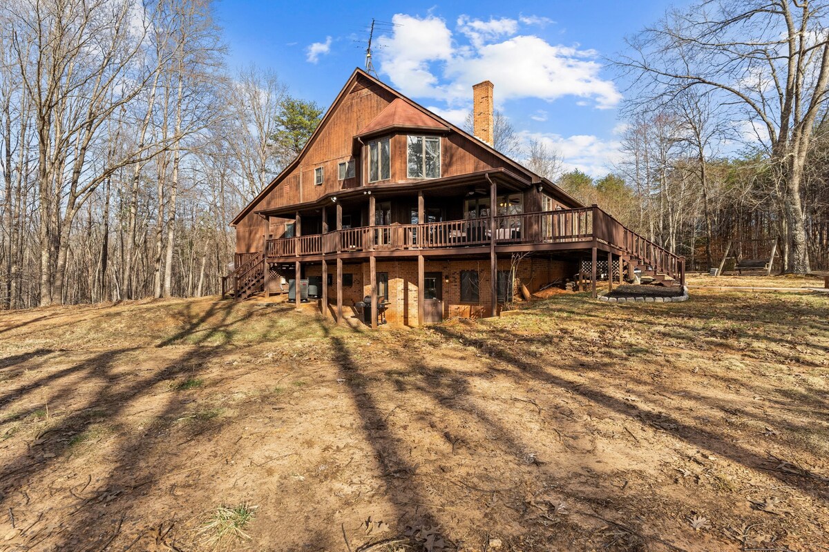 Welcome to 🐻Lazy Bear Lodge🐻!! Escape to this luxurious, secluded 10-acre Wonderland! Vast space to sleep 12, this stunning retreat lets you unwind & enjoy the great outdoors. Relax on the expansive wrap-around deck, by the fire pit, or explore the trails. Enjoy the arcade, billiards, & outdoor games! LBL has 3 levels, 3 spacious bedrooms, & 3 bathrooms. Enjoy a fully equipped kitchen & dine in the elegant dining area or on the deck with breathtaking views of the surrounding nature.
