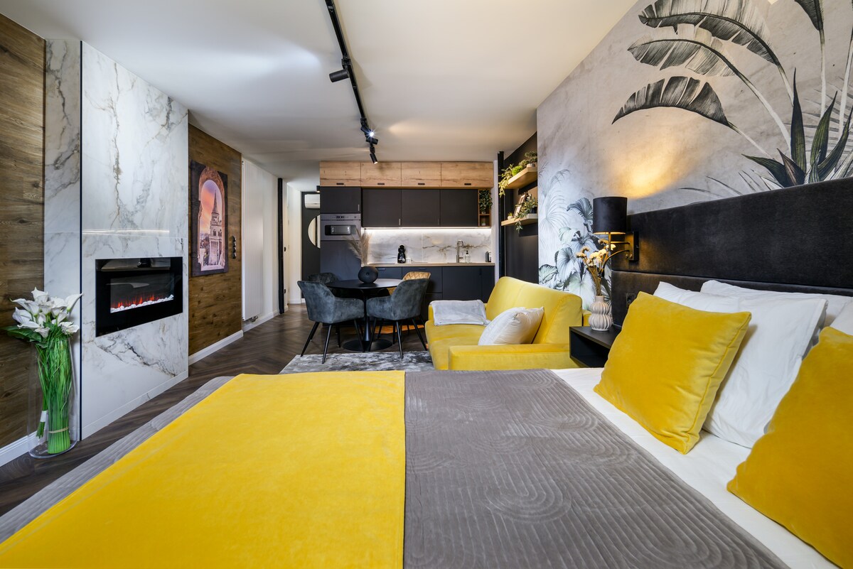 Luxurious 42sqm apartment, with rooftop pool, 2 balconies, safe, free parking at the property! Minutes away from the Opera House, Deak Square, the Budapest Eye, the Parliament, Gozsdu court and the Basilica. The apartment features an open plan living room with electric fireplace, a fully equipped kitchen, a luxurious bathroom, a tranquil bedroom with king size bed & quality bedding in a new development with lift access. The shared rooftop pool can be used by guests from May till October 1st!