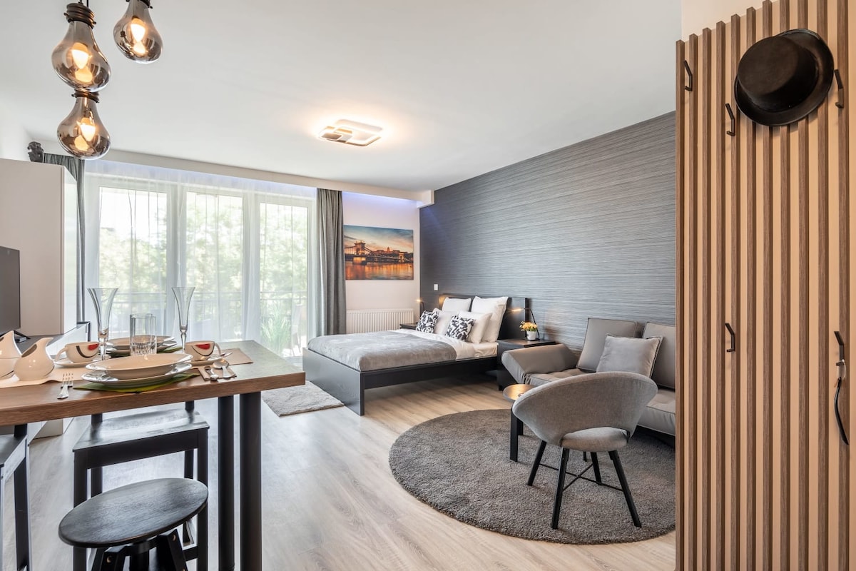 ¡Este acogedor estudio fue diseñado por mí y espero que disfrutes de tu tiempo aquí tanto como yo lo disfruté al crearlo! Creo que es el lugar perfecto para una escapada a la ciudad: está en el corazón de Pest, cerca de muchas atracciones, a la vez que es tranquilo y tranquilo gracias a su ventana que se abre en un patio interior. Tiene todo lo que puedas necesitar para unas vacaciones perfectas: una cama cómoda, una cocina para preparar tus propias comidas si lo deseas, un baño y una bonita sala de estar con un televisor inteligente para el entretenimiento fuera de los lugares de interés.