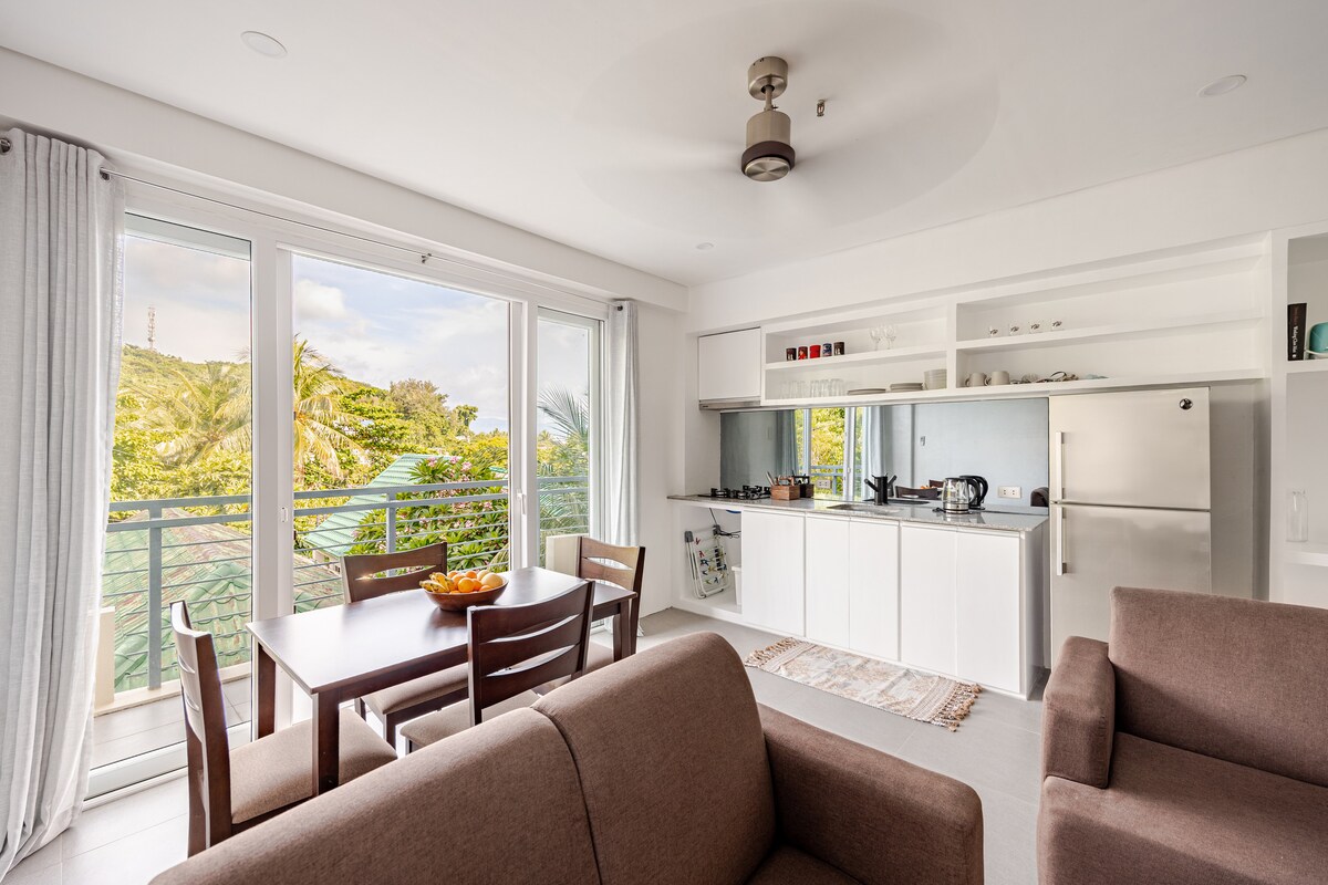 A one-bedroom apartment ideal for families or up to four guests, featuring a bedroom and a flexible living area with two single beds. It includes a dining area and a fully furnished kitchen for added convenience. The unit has three beds, one queen and two singles. It offers a private, quiet setting designed for comfort, relaxation, and privacy throughout your stay.