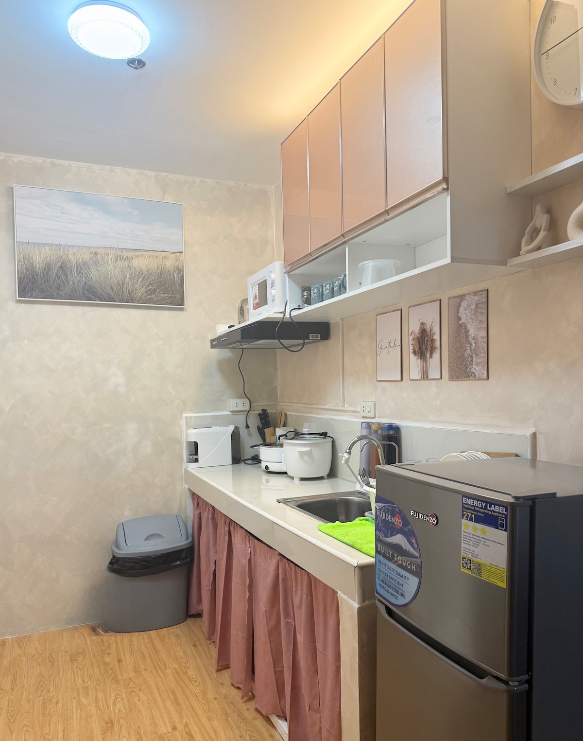 Hotel Staycation de estilo loft de 52 m² Unidad de aire acondicionado de 2,5 HP (2F) y 1,5 HP (GF) Características principales: Kitchen totalmente funcional Refrigerador y horno microondas Cocina de inducción con campana extractora Juego completo de utensilios de cocina Baño con regadera Mesa de comedor de 4 plazas Dormitorio: ideal para 4 personas (cama doble completa con cama semidoble extraíble) Billares ilimitados Máquina arcade (2 PHP = 3 minutos) Pantalla de Android TV: Netflix, YouTube, etc. Juegos de mesa, cartas, etc. Mini karaoke Minibar