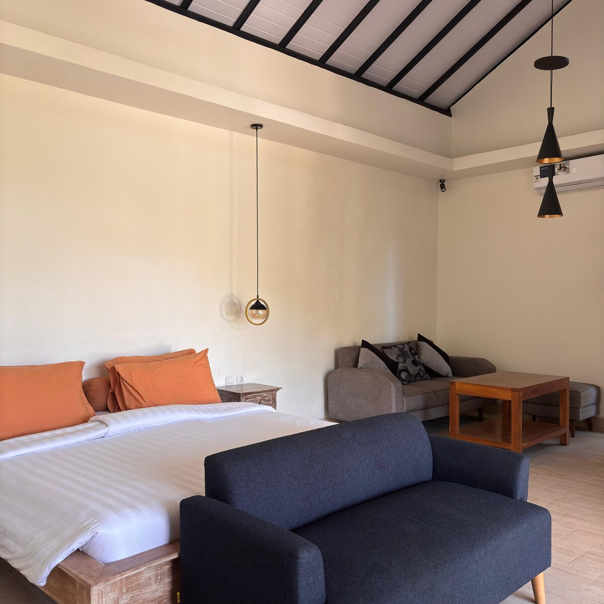 Great value stay just a short walk from the beach—comfortable and budget-friendly. This cozy 1BR bungalow is ideal for couples or solo travelers seeking a quiet place to relax. Enjoy a bright room with natural light, garden views, and a private veranda. Local warungs are right in front, offering affordable meals. The beach is nearby and popular with locals, especially on Saturday evenings.