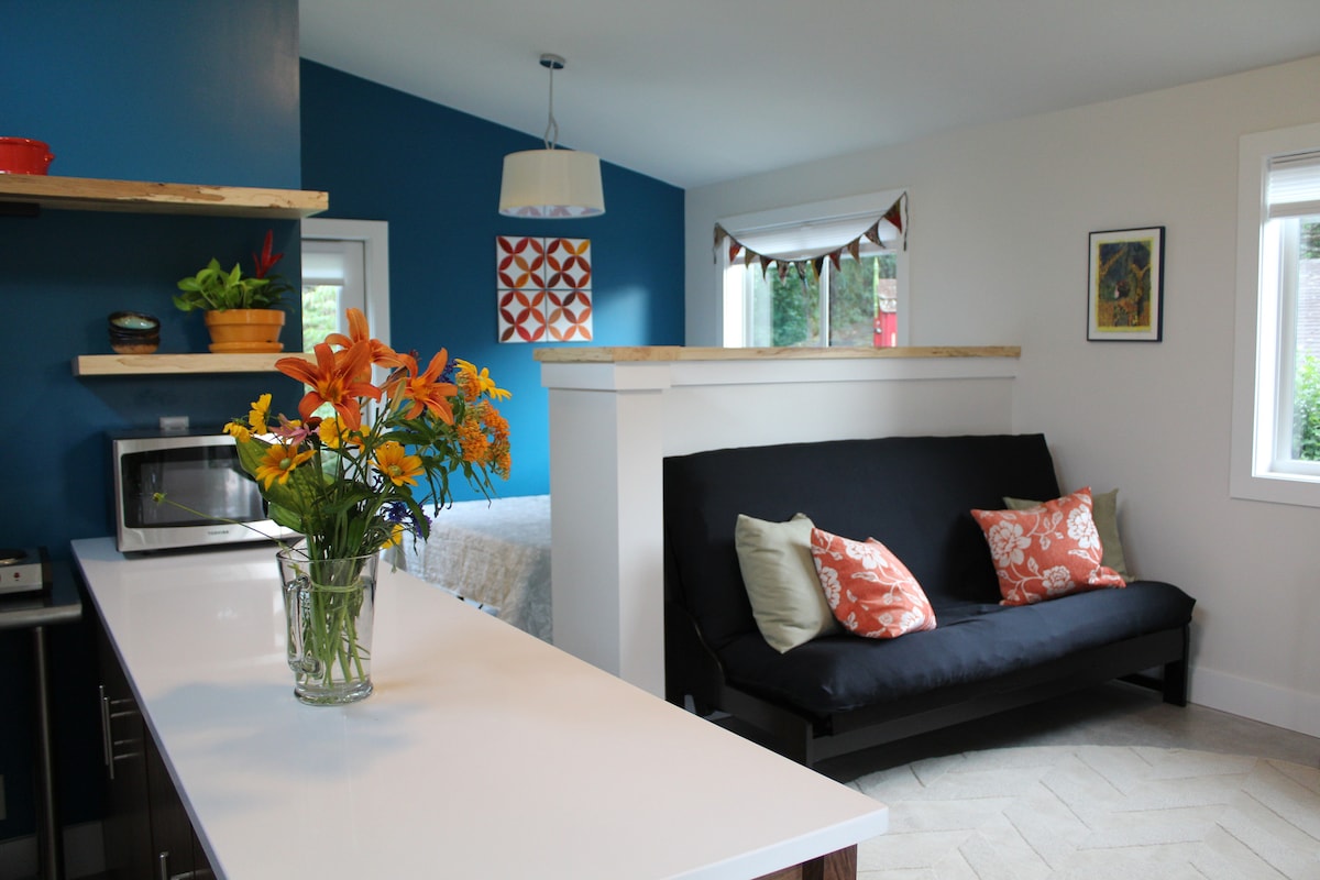 ¡Hermoso estudio de 400 pies cuadrados 100 % ALIMENTADO POR ENERGÍA SOLAR! Entrada privada. Aparcamiento seguro en la calle. Mucha luz natural y servicios. La madera de haya local de Allison acentúa este moderno estudio con obras de arte locales y hermosos jardines. Espacio de patio privado. ¡A 1 milla de Biltmore, cervecerías y Blue Ridge Pkwy! A 3 millas del centro de la ciudad. ¡A poca distancia a pie de la parada de autobús público! Justo al lado de la I-240 y la I-40 en el este de Asheville.