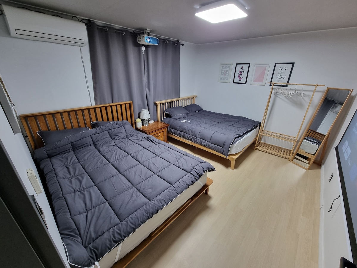 Es un espacio que consta de 1 habitación grande, una cocina separada, un baño y 1 habitación multiusos con refrigerador. Solo hay una cama tamaño queen, por lo que el número estándar de personas es 2. La habitación tiene una cama de almacenamiento, armario, TV de 55 pulgadas, mesa circular de tamaño 800 y tocador. Práctico acceso al transporte público a 3 minutos de la estación universitaria de Gyeongin y a 5 minutos de la estación de Jakjeon. TV de 55 pulgadas, TV inteligente Se puede llegar al aeropuerto de Incheon en unos 40 minutos en transporte público, como el ferrocarril del aeropuerto, a 20 minutos del aeropuerto de Gimpo y Seúl en metro de Incheon y la línea 7 de Seúl durante aproximadamente una hora a Gangnam. Acceso a la estación de Seúl en metro en 45 minutos. Hay una tienda de comestibles cu, gs25 y farmacia a 30 segundos, y hay muchos restaurantes y restaurantes baratos de Baekban cerca del alojamiento. Hay un mercado de operaciones y un mercado de cálculo a 5 minutos de distancia, por lo que puedes comprar verduras y frutas frescas a bajo precio y divertirte de ver. Hay Gyeyangsan, por lo que es un buen lugar para dar un paseo y caminar. Hay muchos estacionamientos públicos baratos cerca, y como el centro comercial está tan desarrollado, hay muchos lugares de estacionamiento frente al centro comercial.