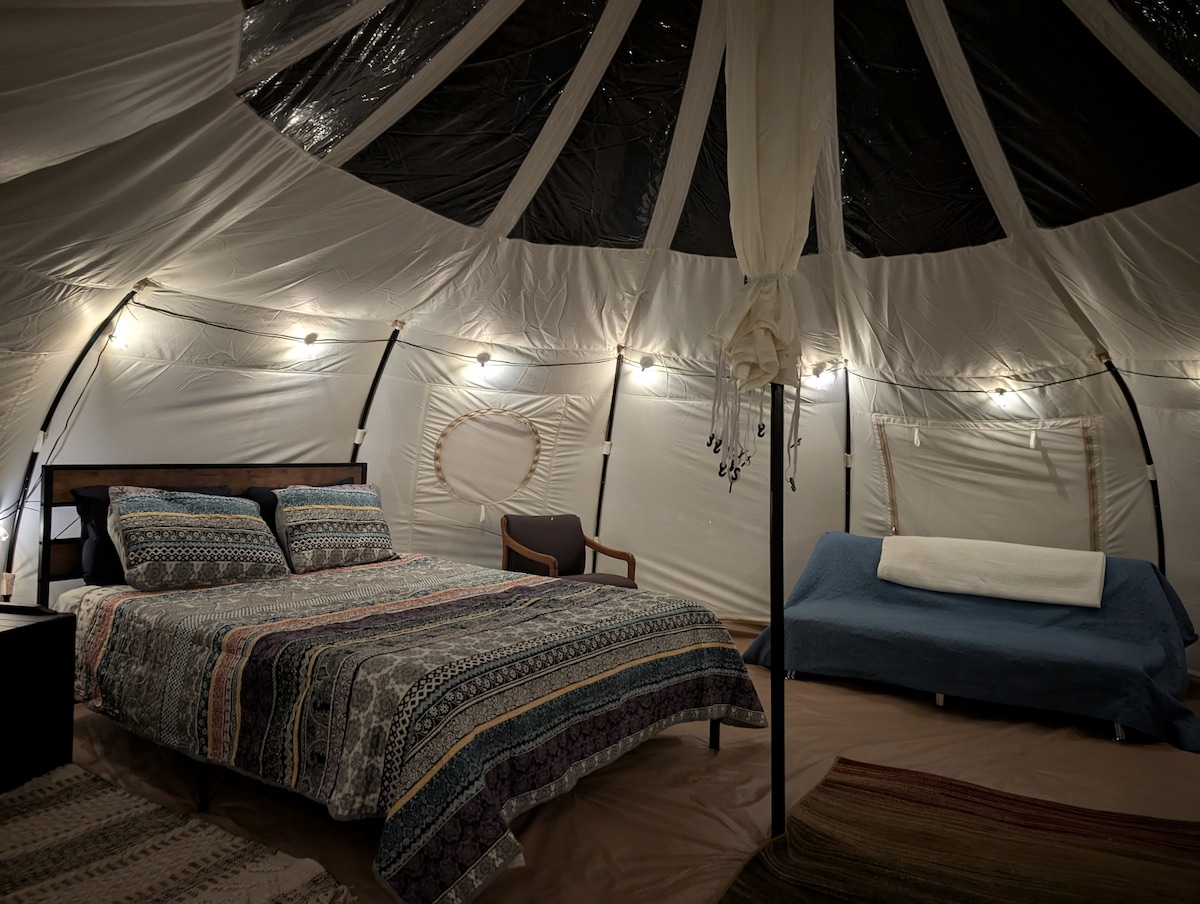 Tienda de campaña glamping tipo yurta en una granja + animales (conejos)