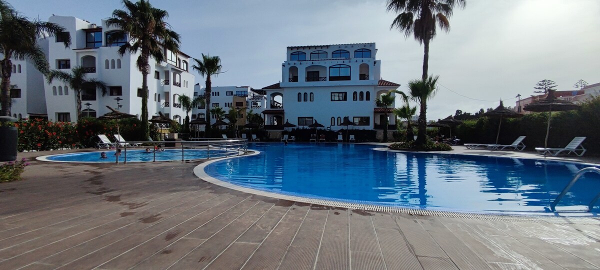 Increíble departamento de 3 camas con todas las comodidades totalmente amueblado con acceso a 7 grandes piscinas, gimnasio exterior, zona de juegos infantiles, estacionamiento privado las 24 horas de seguridad totalmente aislado, wifi gratuito, este apartamento cuenta con impresionantes vistas a la montaña, a poca distancia de la playa, este apartamento está ubicado en el norte de Marruecos.
