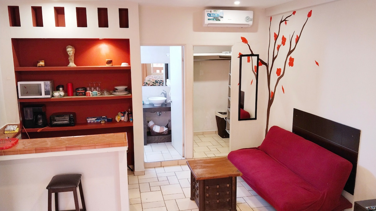 Disfruta de la sencillez, de este alojamiento tipo loft. tranquilo, cálido y céntrico. Con todo lo necesario para que pases tus días de descanso cómodamente, cerca de restaurantes, bares,(por las noches suele oírse música, tómelo en cuenta si tiene sueño ligero). Tiendas Oxxo, de ropa, a 5 minutos caminando de la Marina, y del centro comercial puerto paraíso. La playa más cerca está a 15 minutos caminando. Cuenta con una pequeña cocina, dentro del alojamiento. Paradas de camiones y taxis cerca.