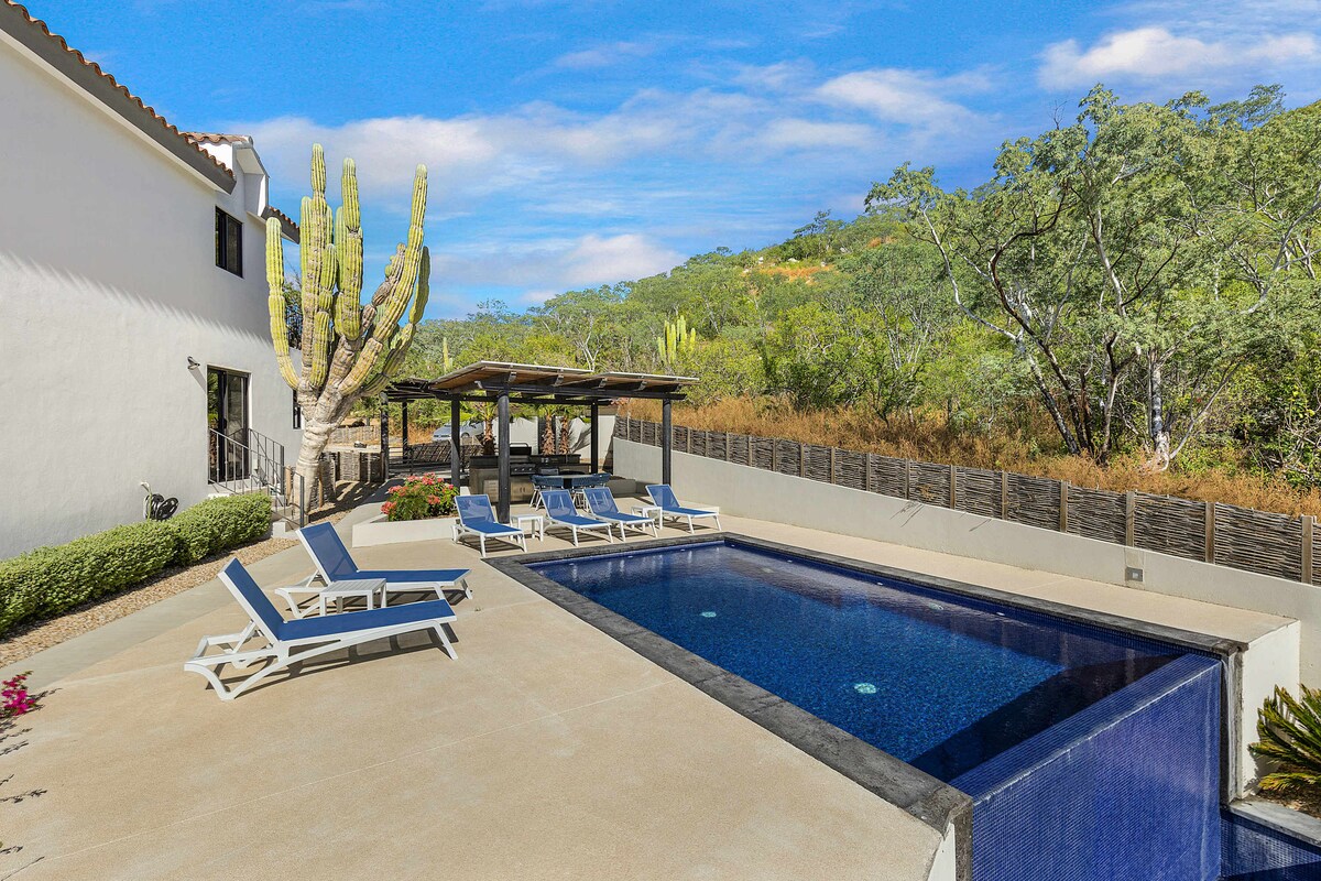 Piensa en una escapada corta o mes(es) para descansar/trabajar a distancia o explorar Baja. El diseño abierto permite un estilo de vida cómodo para solo una pareja, pero puede adaptarse a una reunión de hasta 10 personas. -- Incluye 3 dormitorios + un pequeño dormitorio con litera en la planta superior. + 5º dormitorio tipo estudio independiente en la planta baja con entrada independiente. -- Cocina bien equipada, barbacoa. -- Área de patio y piscina grande, nivelada y muy privada. Sin espacios compartidos. -- Ubicación ideal. Playa, restaurantes y tiendas a poca distancia a pie, a 5-10 minutos. Estacionamiento para 1 auto. ¡Ven y disfruta!